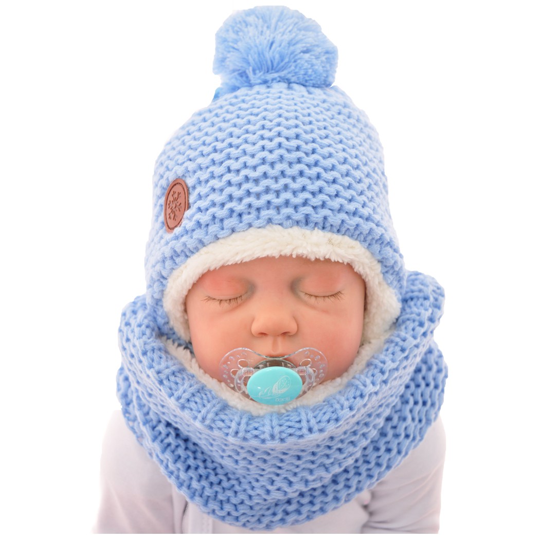 Ciepły komplet dla noworodka ochroni zarówno główkę jak i szyję dziecka. Idealnie sprawdzi się w okresie zimowym do kombinezonu niemowlęcego.