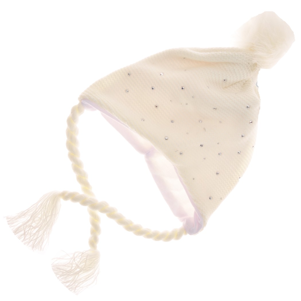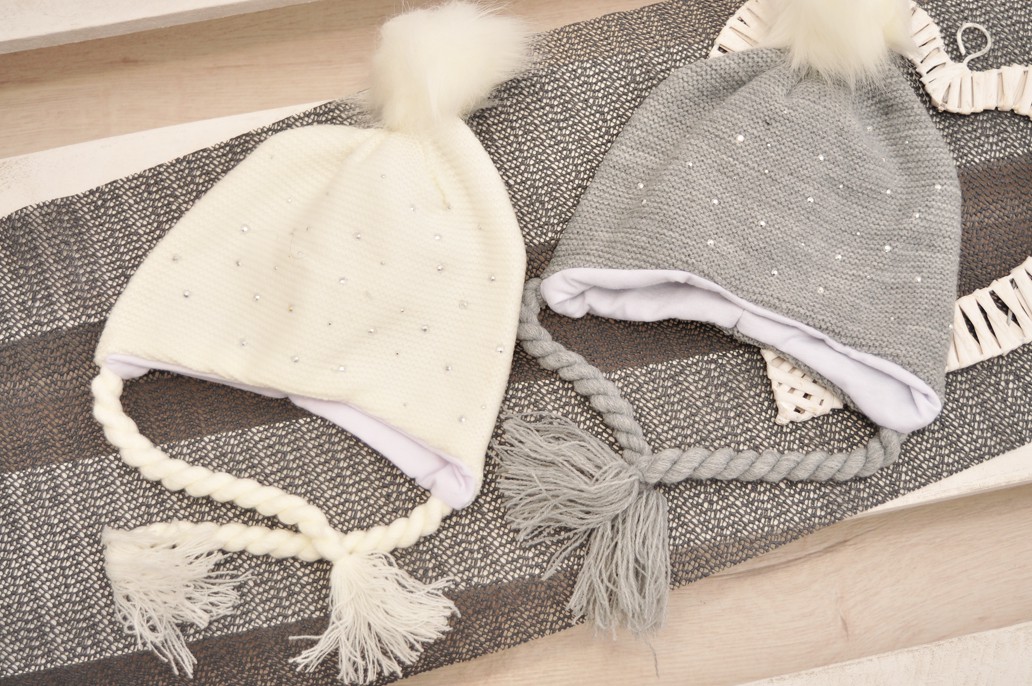 Dziewczęca czapeczka na główkę wiązana pod szyją, na fantazyjnie splecione troczki z frędzelkami. Czapka zimowa z pomponem uszyta z 2 warstw materiału. Zewnętrzna warstwa wykonana z akrylowej dzianiny o splocie warkoczowym a od środka obszyta białą bawełną. Wyjątkowego uroku dodają czapeczce błyszczące srebrne jety.