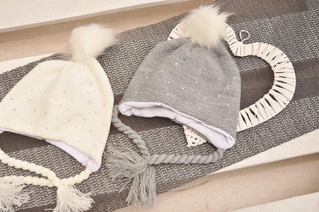 Dziewczęca czapeczka na główkę wiązana pod szyją, na fantazyjnie splecione troczki z frędzelkami. Czapka zimowa z pomponem uszyta z 2 warstw materiału. Zewnętrzna warstwa wykonana z akrylowej dzianiny o splocie warkoczowym a od środka obszyta białą bawełną. Wyjątkowego uroku dodają czapeczce błyszczące srebrne jety.