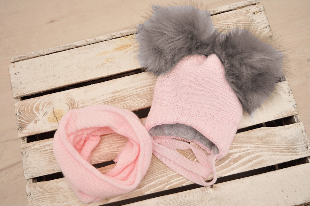 W skład kompletu wchodzi różowa czapka z pomponami i komin niemowlęcy. Jest ona wiązana pod szyją, a niepowtarzalnego stylu dodają jej dwa duże, puchate pompony z imitacji futra. Różowa czapka i komin dla noworodka uszyta z 2 warstw materiału, zewnętrzna warstwa wykonana z akrylowej dzianiny w kolorze różowym a od środka 100% bawełna w kolorze szary melanż. Uzupełnienie czapeczki stanowi akrylowy komin - tuba, zakładany na raz, przylegający do szyi w kolorze różowym.