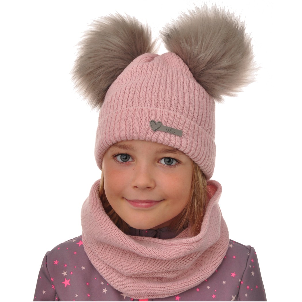 W skład kompletu wchodzi pudrowa czapka, której niepowtarzalnego stylu dodają dwa duże, puchate pompony z imitacji futra oraz emblemat producenta z serduszkiem. Czapka uszyta z 2 warstw materiału, zewnętrzna warstwa wykonana z akrylowej dzianiny w kolorze pudrowego różu a od środka 100% bawełna w kolorze szary melanż. Uzupełnienie czapeczki stanowi akrylowy komin - tuba, zakładany na raz, przylegający do szyi również w kolorze pudrowego różu.