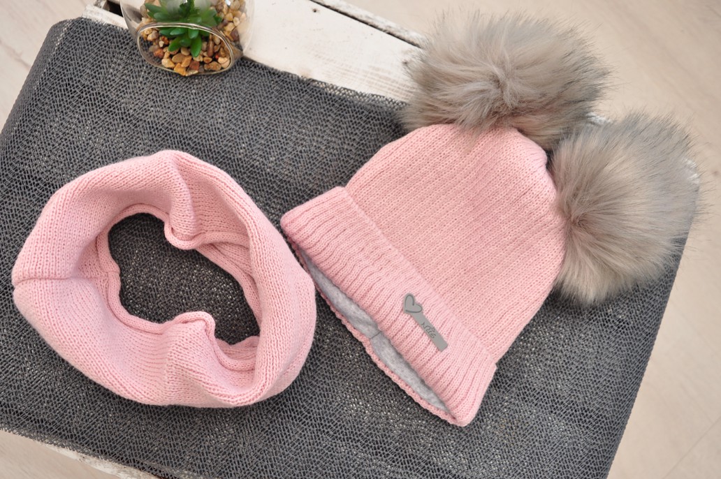 Zimowy komplet 2 częściowy: czapeczka z puchatymi pomponami + komin w kolorze pudrowego różu.