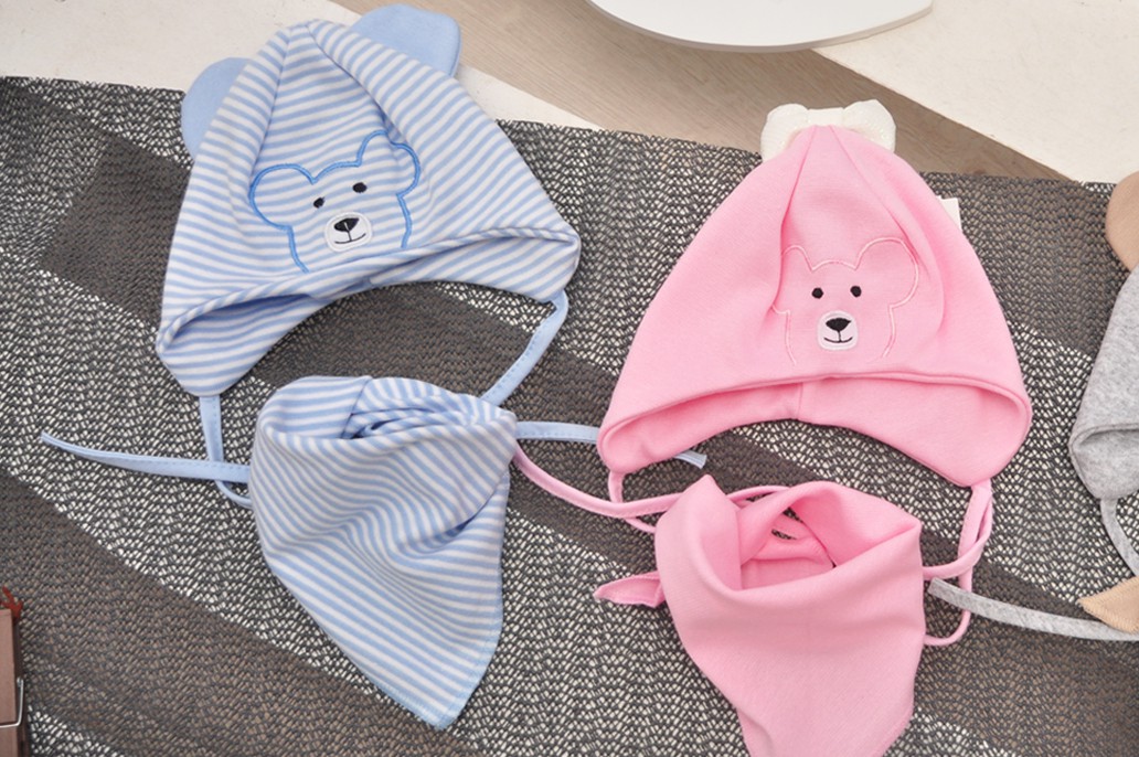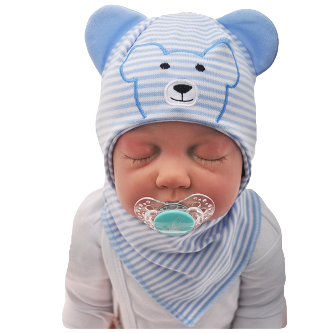 W skład kompletu wchodzi czapka na główkę wiązana pod szyją. Oferowany model to dziecięca czapeczka z wyszytą aplikacja misia, odpowiednia zarówno jako czapeczka wiosenna, jak i czapeczka jesienna. Czapeczka w obrębie uszu uszyta jest z 2 warstw materiału. Jej wyjątkową ozdobę stanowią trójwymiarowe, niebieskie misiowe uszka. Uzupełnieniem czapeczki jest trójkątna apaszka w biało-niebieskie paski.