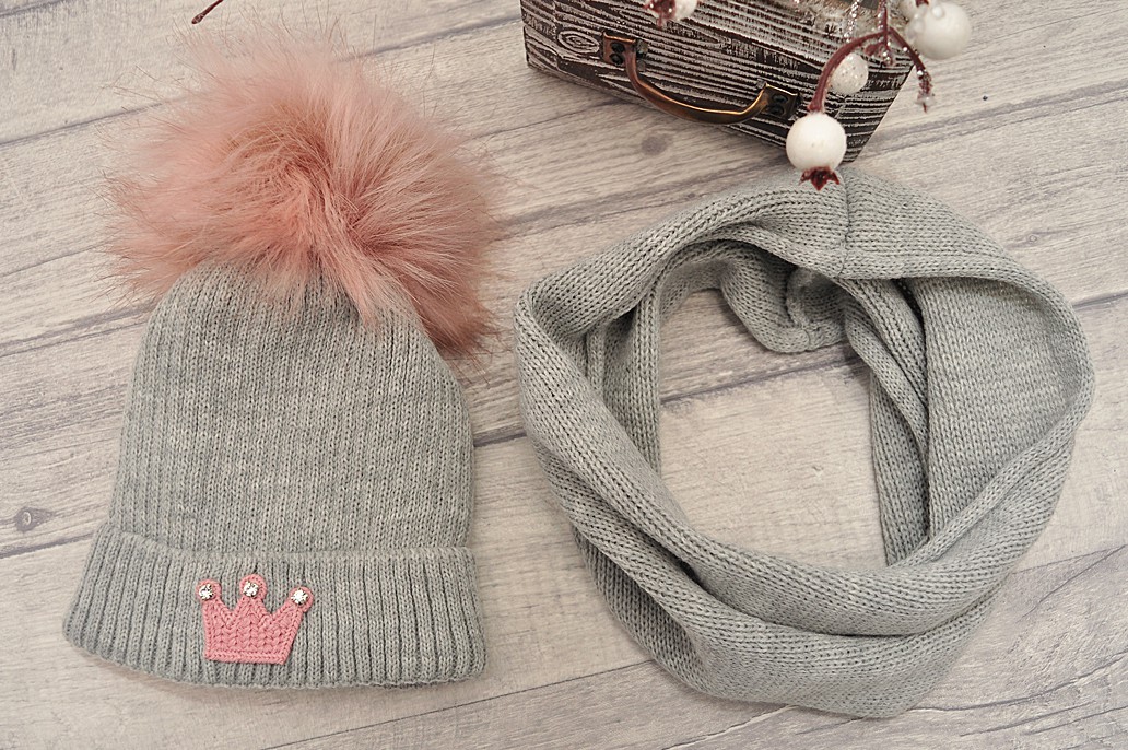Szara czapka z pomponem i komin dla dziewczynki.
