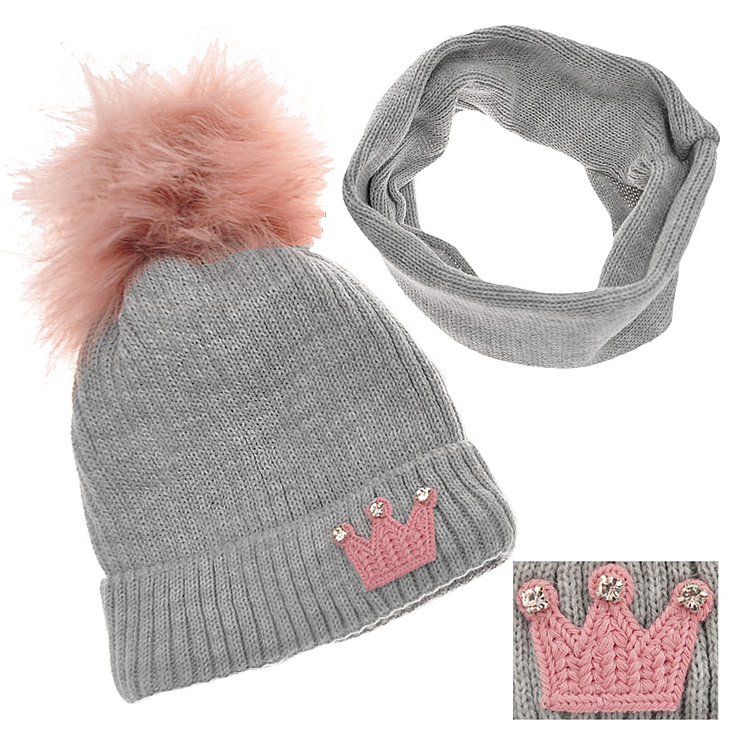 Szary komplet zimowy PUCHATY POMPON czapka + komin, emblemat korona