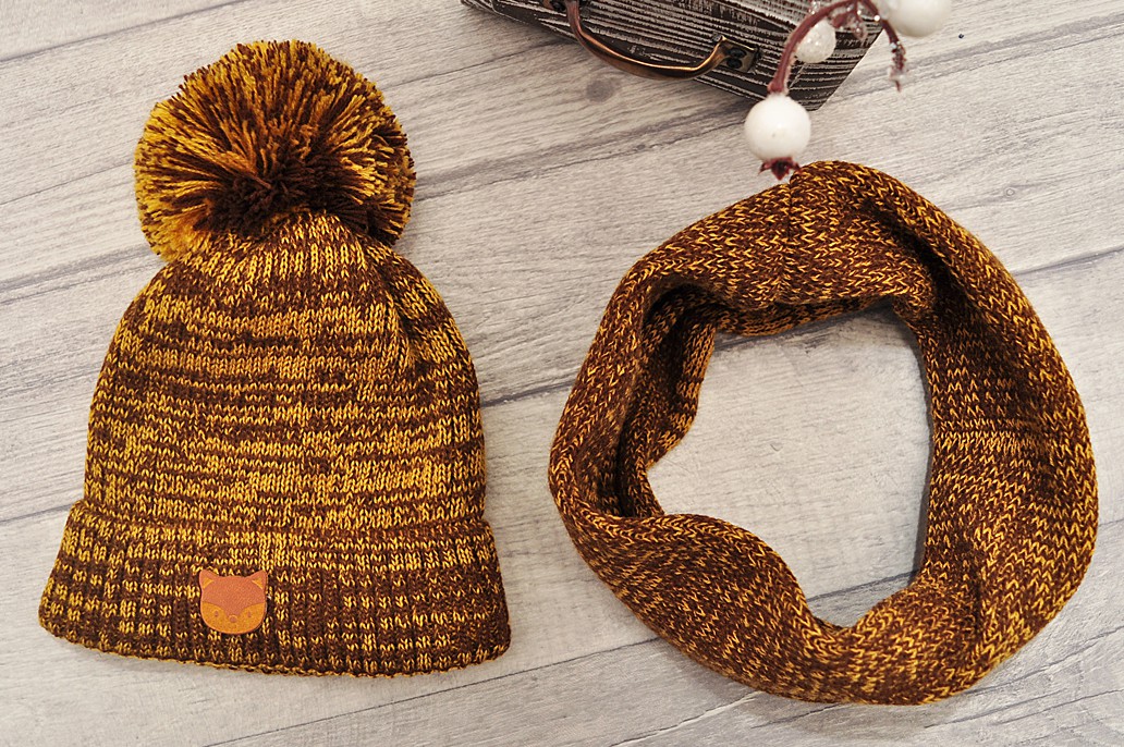 Musztardowo-brązowa czapka z pomponem i komin dla chłopca.