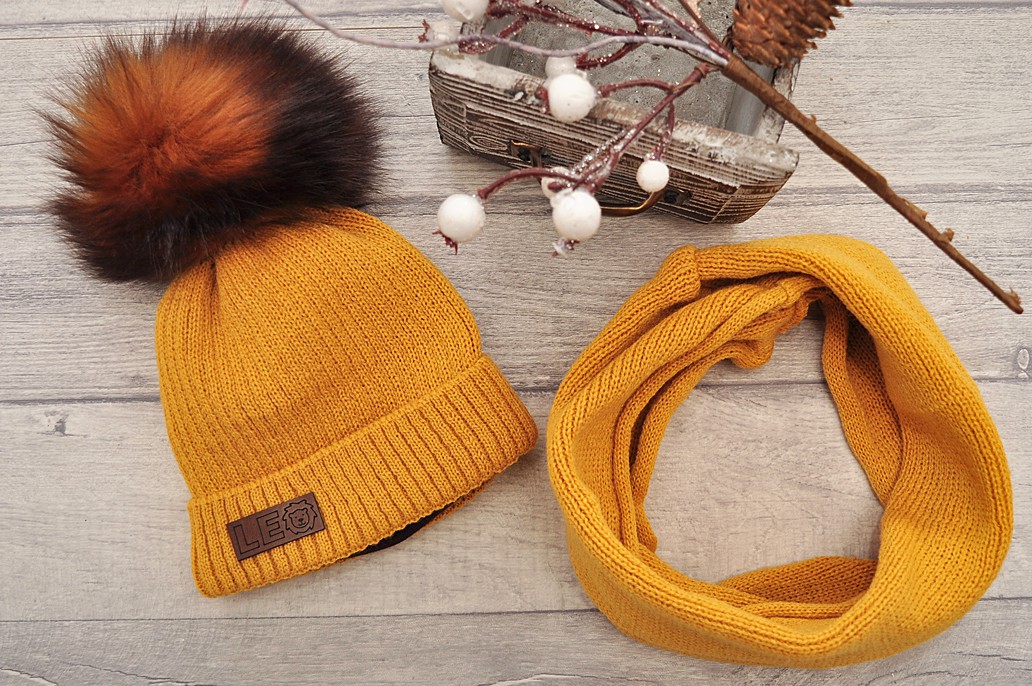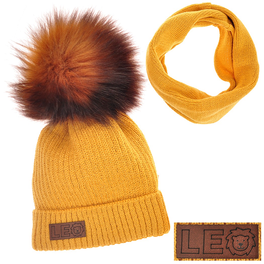Musztardowy komplet zimowy LEO czapka + komin emblemat z lwem