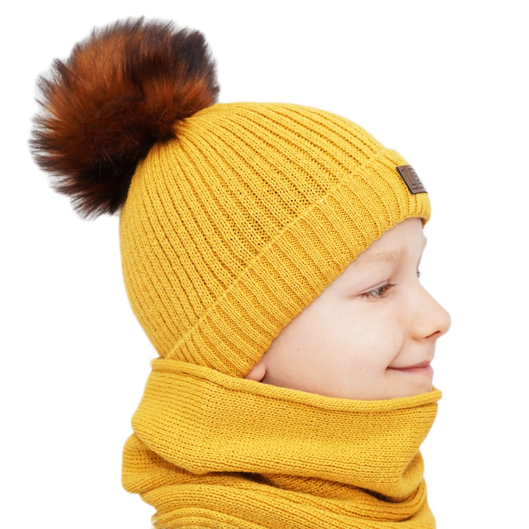 Musztardowa czapka z pomponem i komin dla chłopca.
