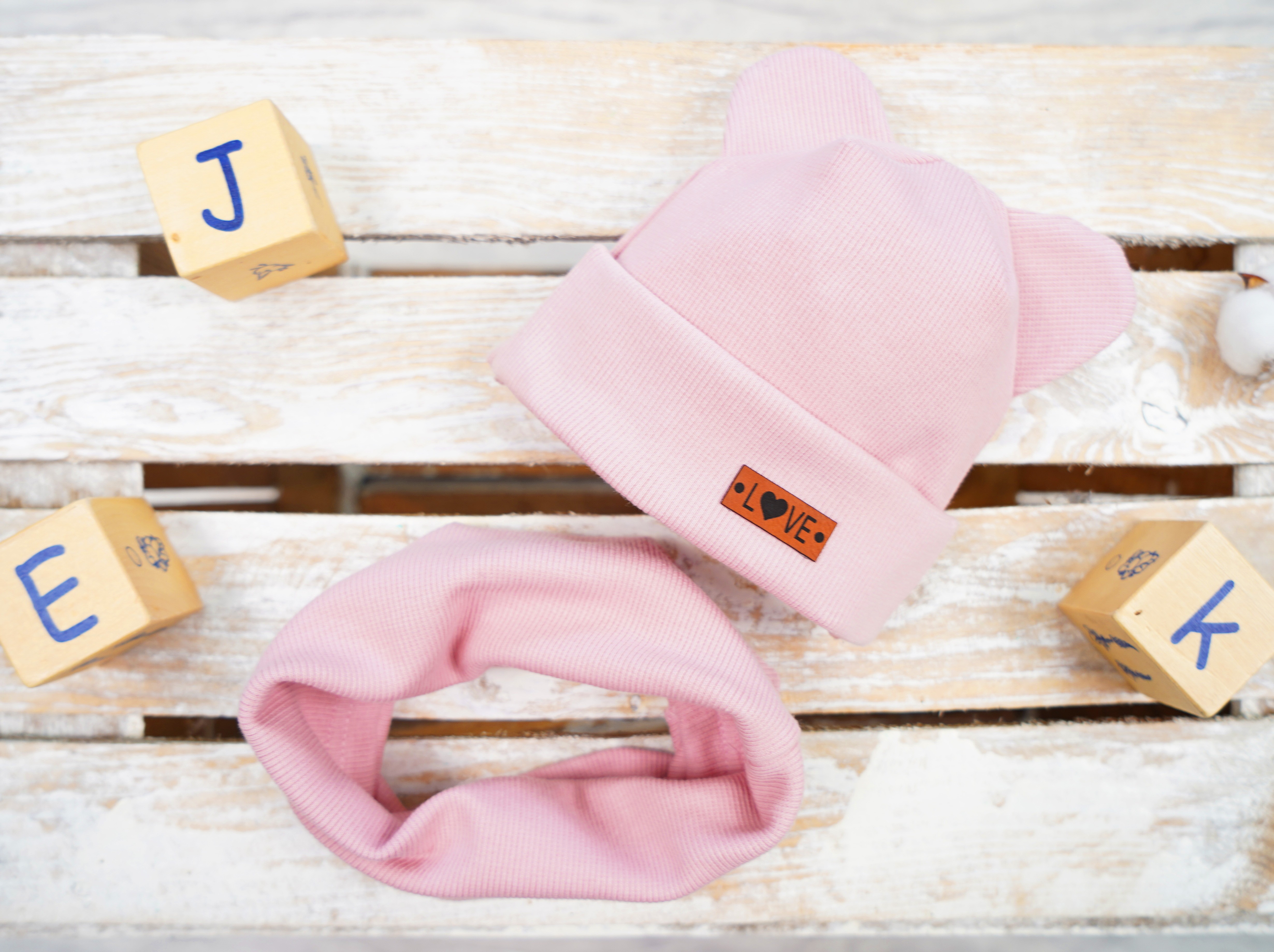W skład kompletu wchodzi brudno różowa czapka z prążkowanej dzianiny z ozdobnymi uszkami. Dziecięca czapeczka posiada wyszytą aplikacja z napisem LOVE. Jest odpowiednia zarówno jako czapeczka wiosenna, jak i czapeczka jesienna. Czapeczka uszyta z jednej warstwy materiału, podwiniętej aby lepiej chronić uszy dziecka. Uzupełnieniem czapeczki jest komin w tym samym kolorze.