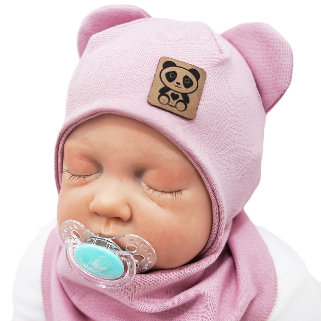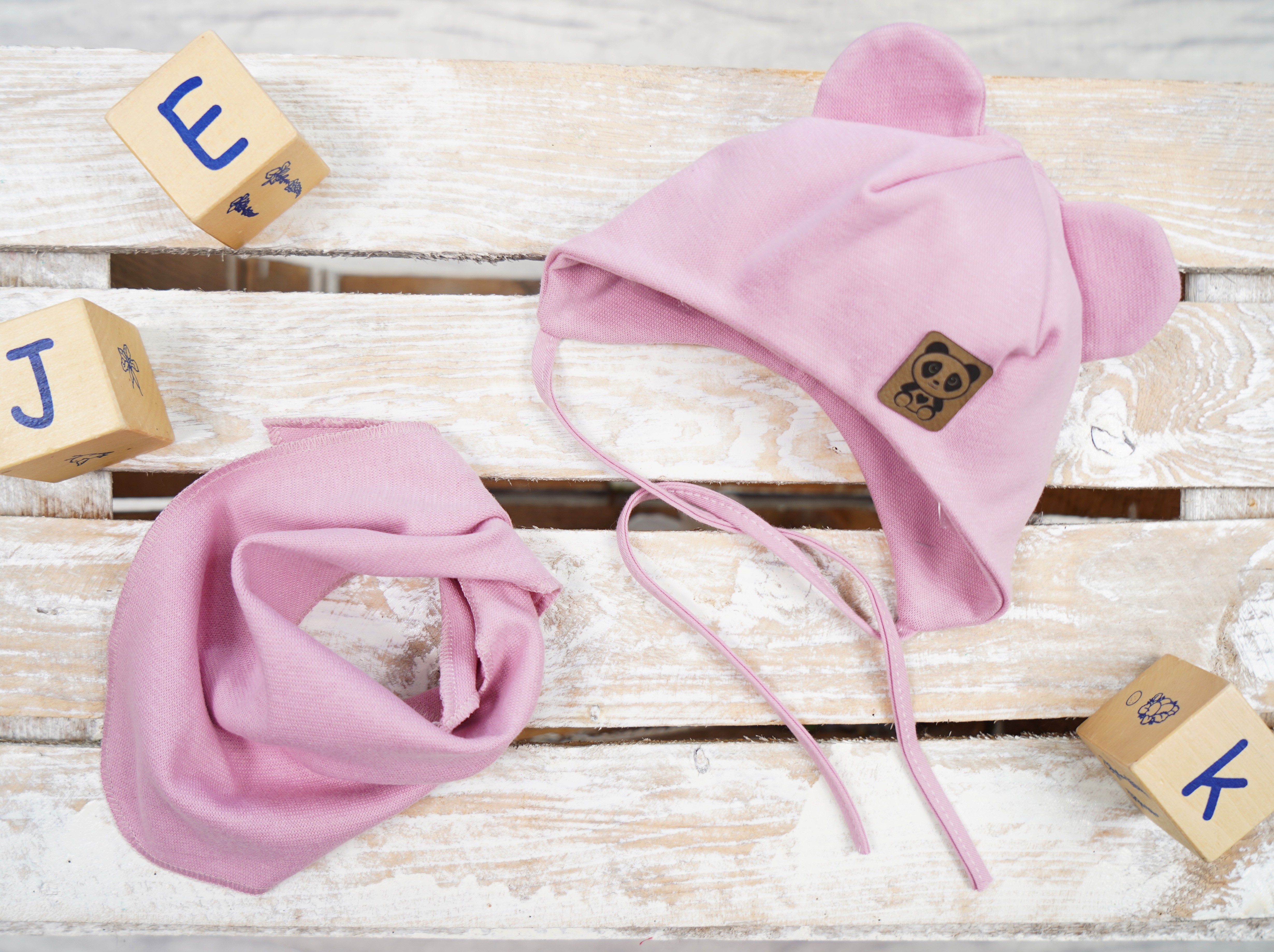 W skład kompletu wchodzi różowa, bawełniana czapka ozdobiona uszkami, wiązana pod szyją. Oferowany model to dziecięca czapeczka z wyszytą brązową aplikacja z pandą, odpowiednia zarówno jako czapeczka wiosenna, jak i czapeczka jesienna. Uzupełnieniem czapeczki jest trójkątna apaszka w tym samym kolorze.