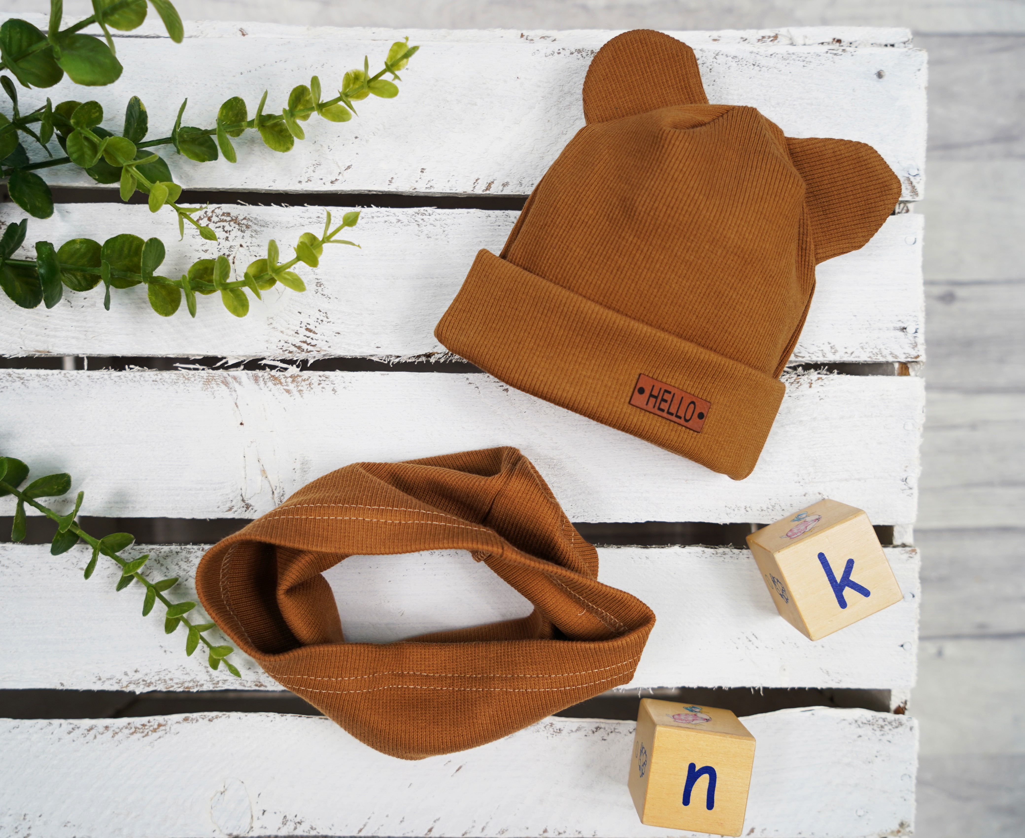 W skład kompletu wchodzi brązowa czapka z prążkowanej dzianiny z ozdobnymi uszkami. Dziecięca czapeczka posiada wyszytą aplikacja z napisem HELLO. Jest odpowiednia zarówno jako czapeczka wiosenna, jak i czapeczka jesienna. Czapeczka uszyta z jednej warstwy materiału, podwiniętej aby lepiej chronić uszy dziecka. Uzupełnieniem czapeczki jest komin w tym samym kolorze.