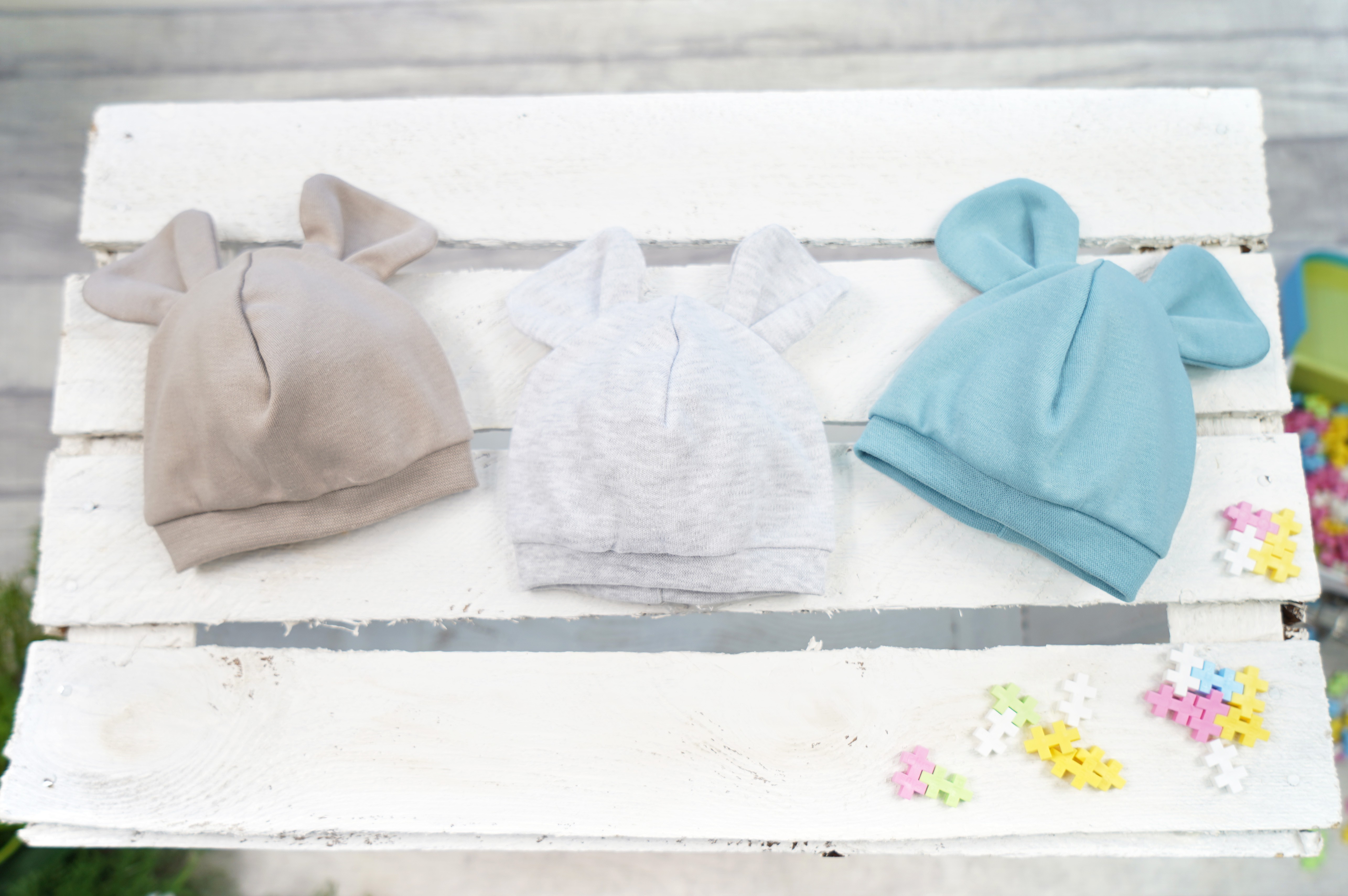 3 bawełniane czapeczki smerfetki w kolorze iceberg, szarym i piaskowym – na obwód główki 36-38cm