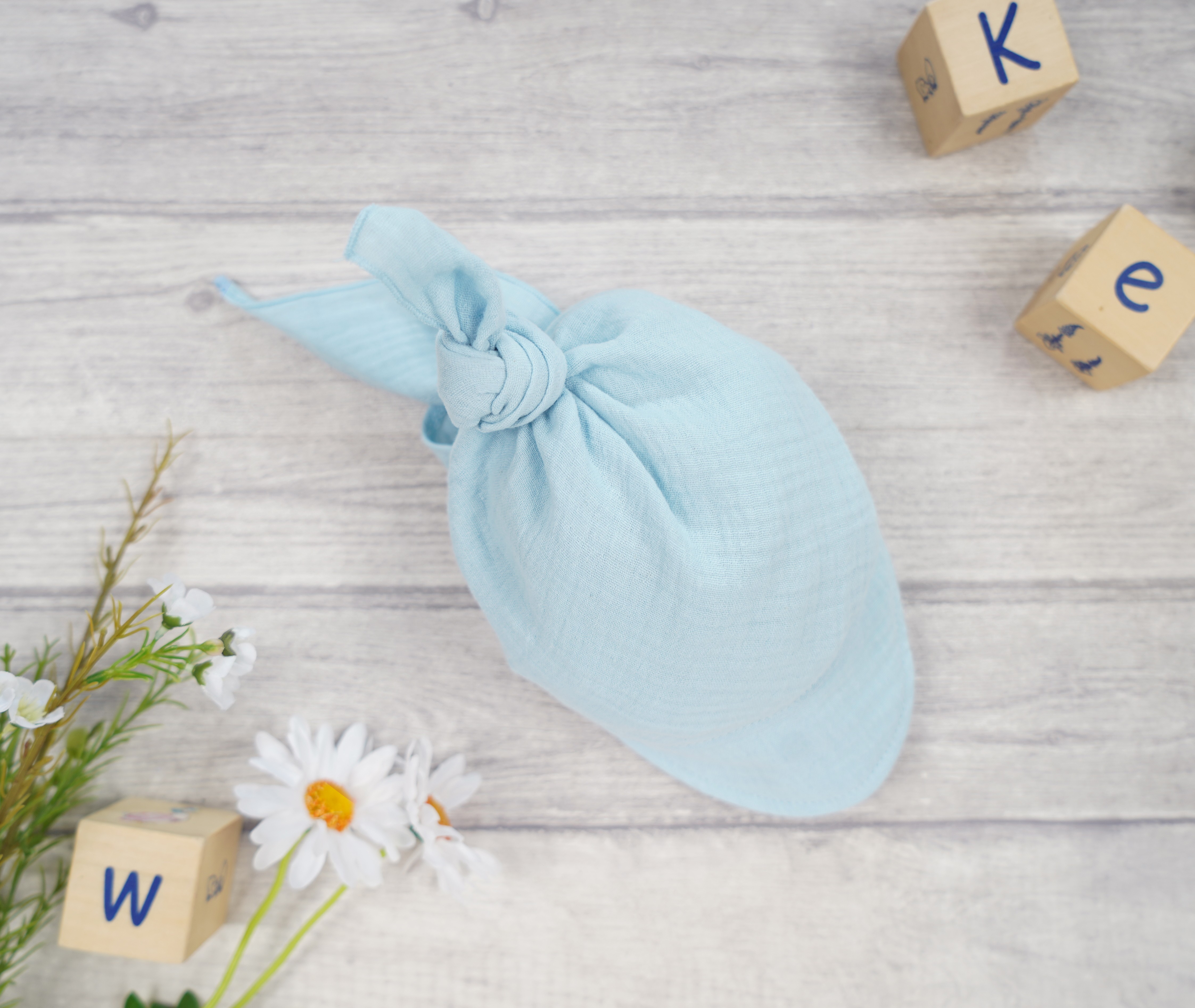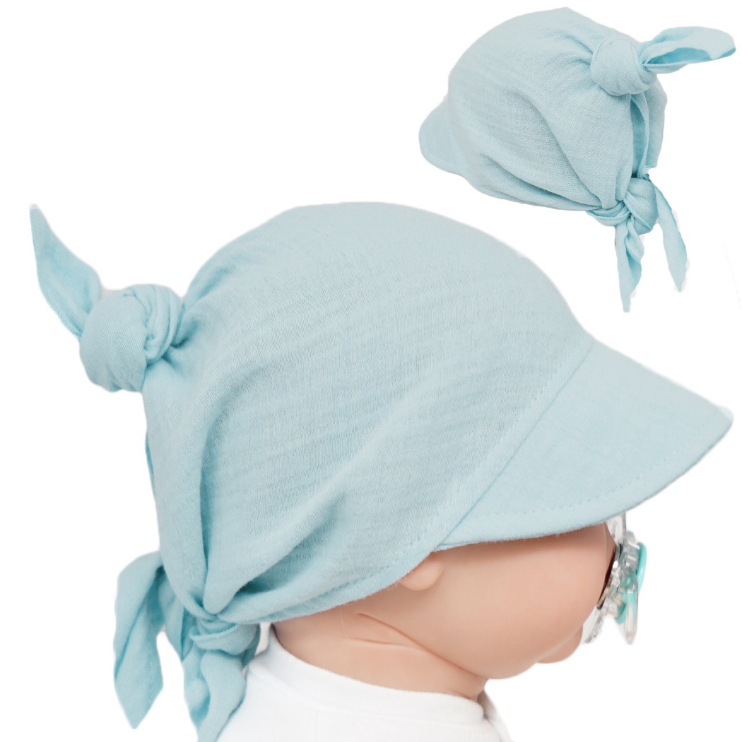 Czapka CHUSTA muślinowa błękitna z daszkiem wiązana LATO