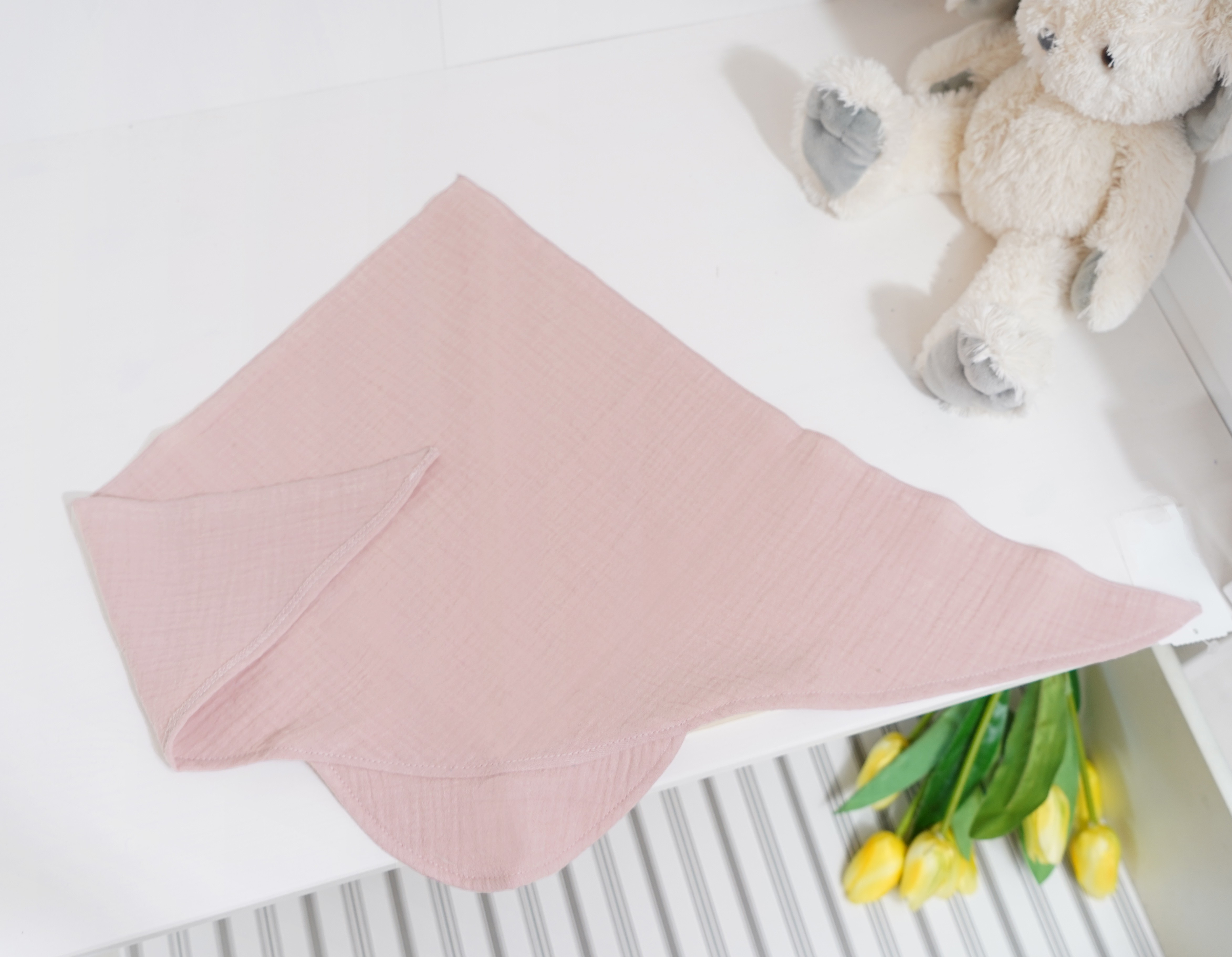Miękki i wygodny materiał- przewiewna i naturalna tkanina z której wykonana jest chusteczka to miękka i miła w dotyku muślinowa bawełna, co zapewnia komfort tym najbardziej wymagającym. Dzięki wykorzystaniu bardzo miękkiej tkaniny, chusteczka nie spowoduje podrażnień oraz zapobiegnie przetarciom nawet na wrażliwej skórze maluszka.