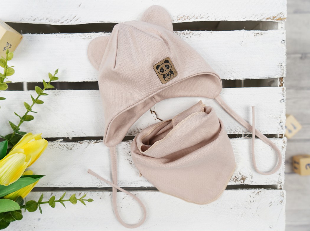 W skład kompletu wchodzi beżowa, bawełniana czapka ozdobiona uszkami, wiązana pod szyją. Oferowany model to dziecięca czapeczka z wyszytą brązową aplikacja z pandą, odpowiednia zarówno jako czapeczka wiosenna, jak i czapeczka jesienna. Uzupełnieniem czapeczki jest trójkątna apaszka w tym samym kolorze.
