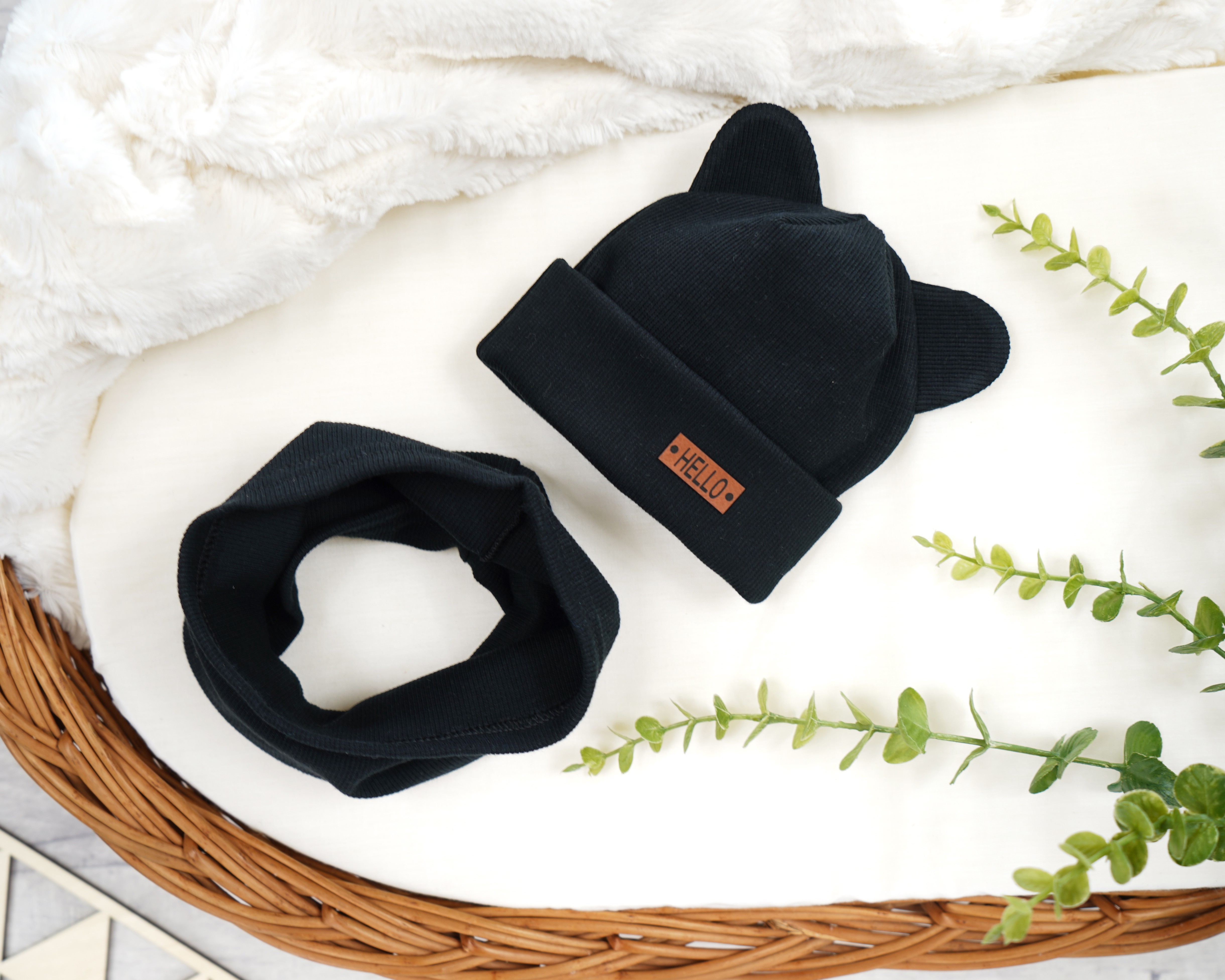 W skład kompletu wchodzi czarna czapka z prążkowanej dzianiny z ozdobnymi uszkami. Dziecięca czapeczka posiada wyszytą aplikacja z napisem HELLO. Jest odpowiednia zarówno jako czapeczka wiosenna, jak i czapeczka jesienna. Czapeczka uszyta z jednej warstwy materiału, podwiniętej aby lepiej chronić uszy dziecka. Uzupełnieniem czapeczki jest komin w tym samym kolorze.