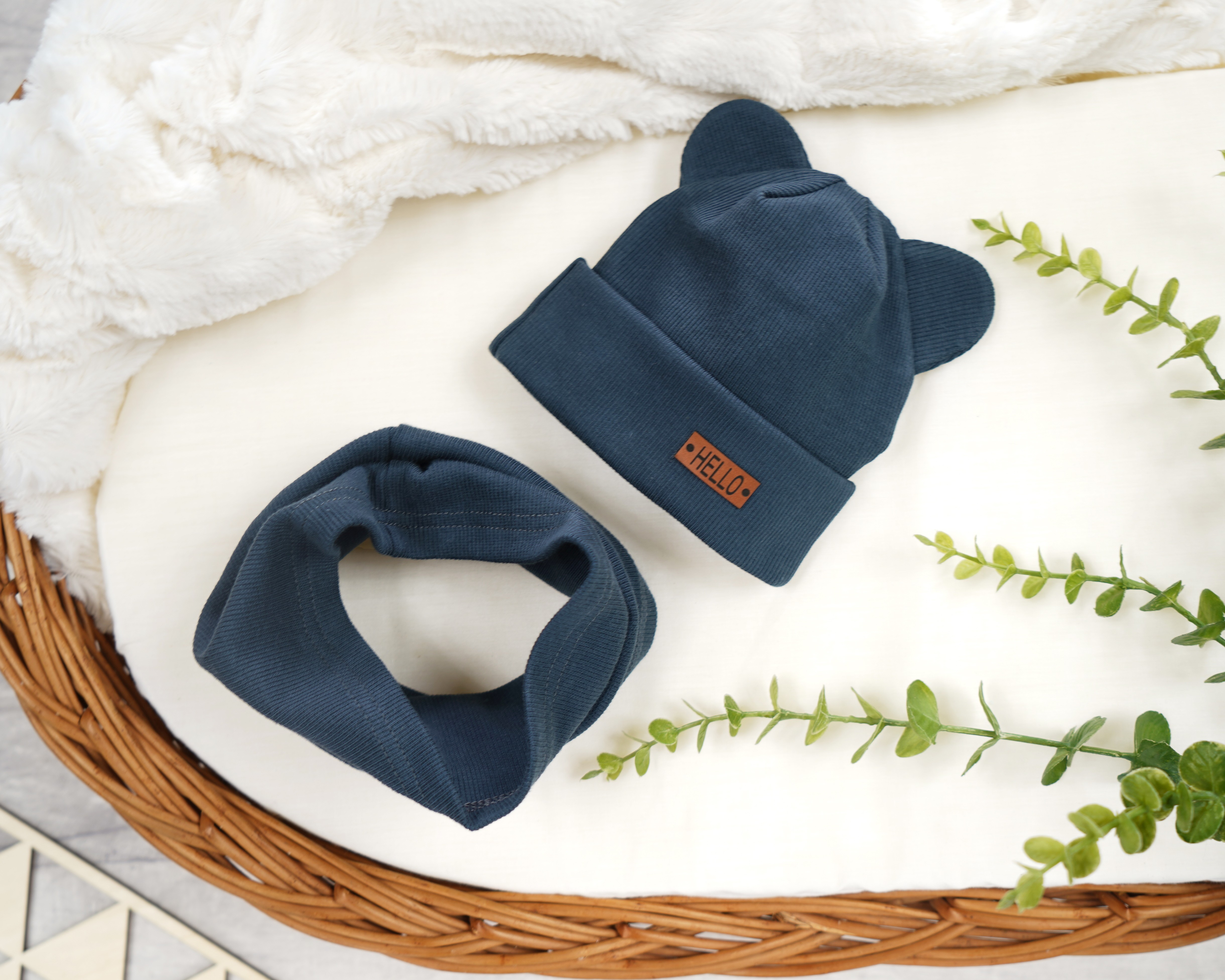 W skład kompletu wchodzi grafitowa czapka z prążkowanej dzianiny z ozdobnymi uszkami. Dziecięca czapeczka posiada wyszytą aplikacja z napisem HELLO. Jest odpowiednia zarówno jako czapeczka wiosenna, jak i czapeczka jesienna. Czapeczka uszyta z jednej warstwy materiału, podwiniętej aby lepiej chronić uszy dziecka. Uzupełnieniem czapeczki jest komin w tym samym kolorze.