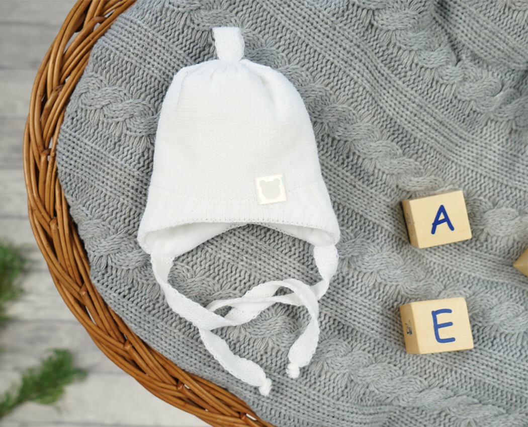 Ocieplana biała czapka dla noworodka odpowiednio ochroni główkę dziecka w okresie zimowym. Idealnie sprawdzi się pod kaptur kombinezonu niemowlęcego.