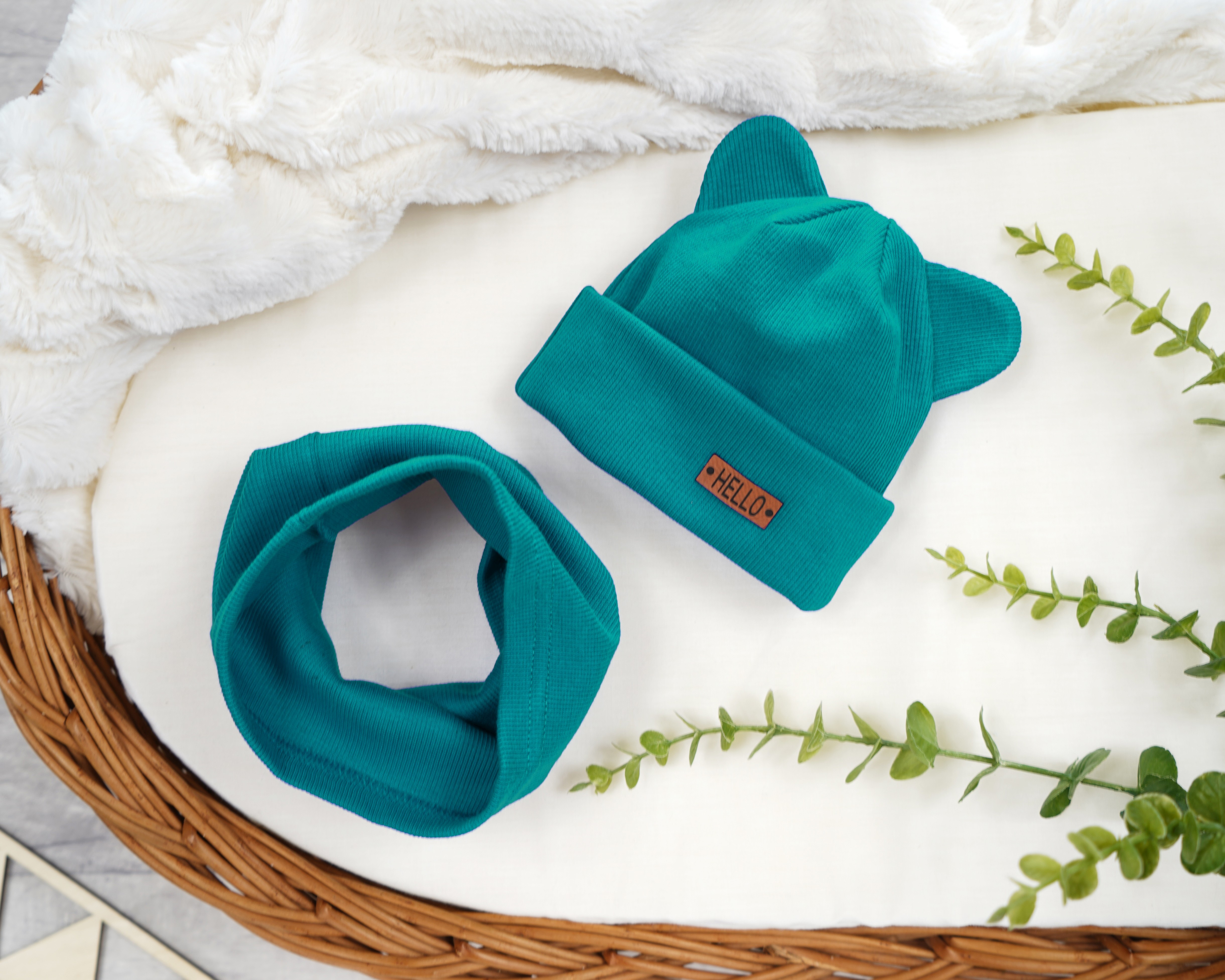 W skład kompletu wchodzi morska czapka z prążkowanej dzianiny z ozdobnymi uszkami. Dziecięca czapeczka posiada wyszytą aplikacja z napisem HELLO. Jest odpowiednia zarówno jako czapeczka wiosenna, jak i czapeczka jesienna. Czapeczka uszyta z jednej warstwy materiału, podwiniętej aby lepiej chronić uszy dziecka. Uzupełnieniem czapeczki jest komin w tym samym kolorze.