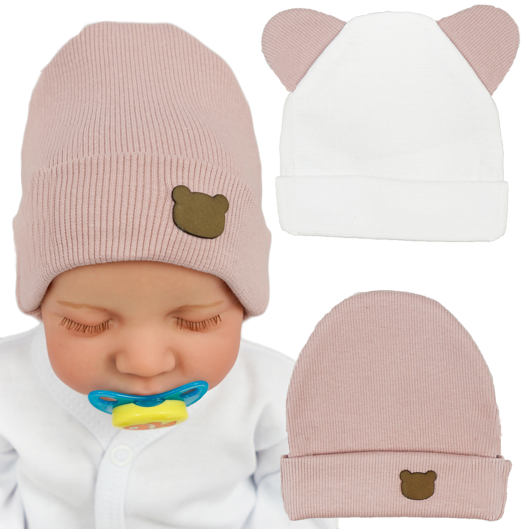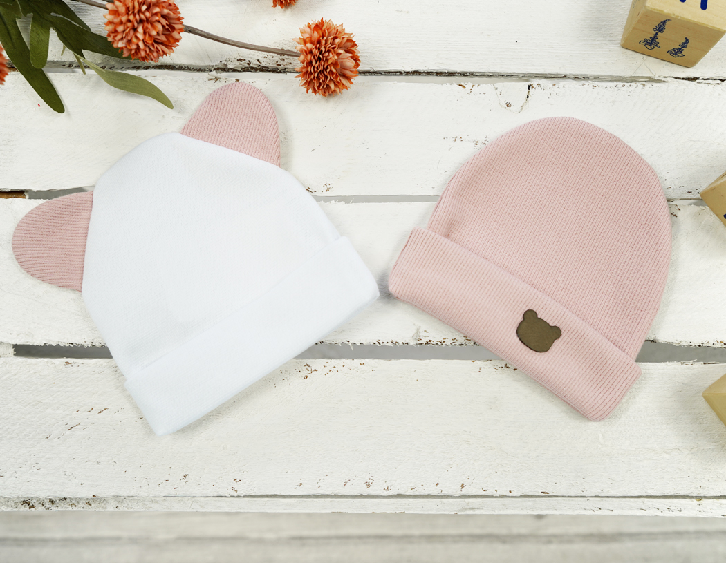 W skład kompletu wchodzi: brudno różowa czapka z prążkowanej dzianiny z ozdobnym emblematem misia, oraz dziecięca czapeczka biała, bawełniana z różowymi, prążkowymi uszkami. Czapeczki odpowiednie są na każdą porę roku, do użytku dla niemowląt np.: po kąpieli lub tez na noc. Czapeczka uszyta z jednej warstwy materiału, podwiniętej aby lepiej chronić uszy dziecka.