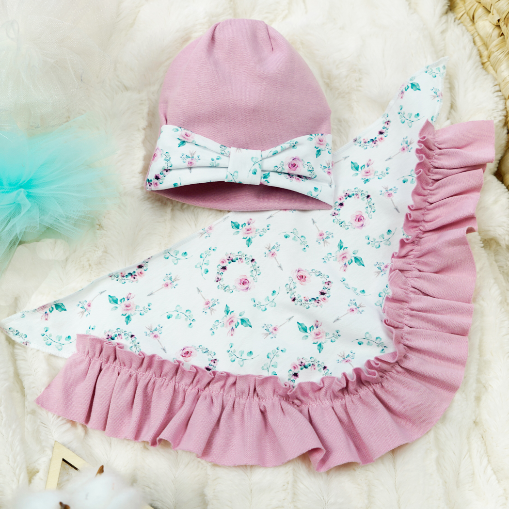 Różowy komplet CZAPKA + APASZKA z kokardką falbanką w kwiaty Maja wyprzedaż