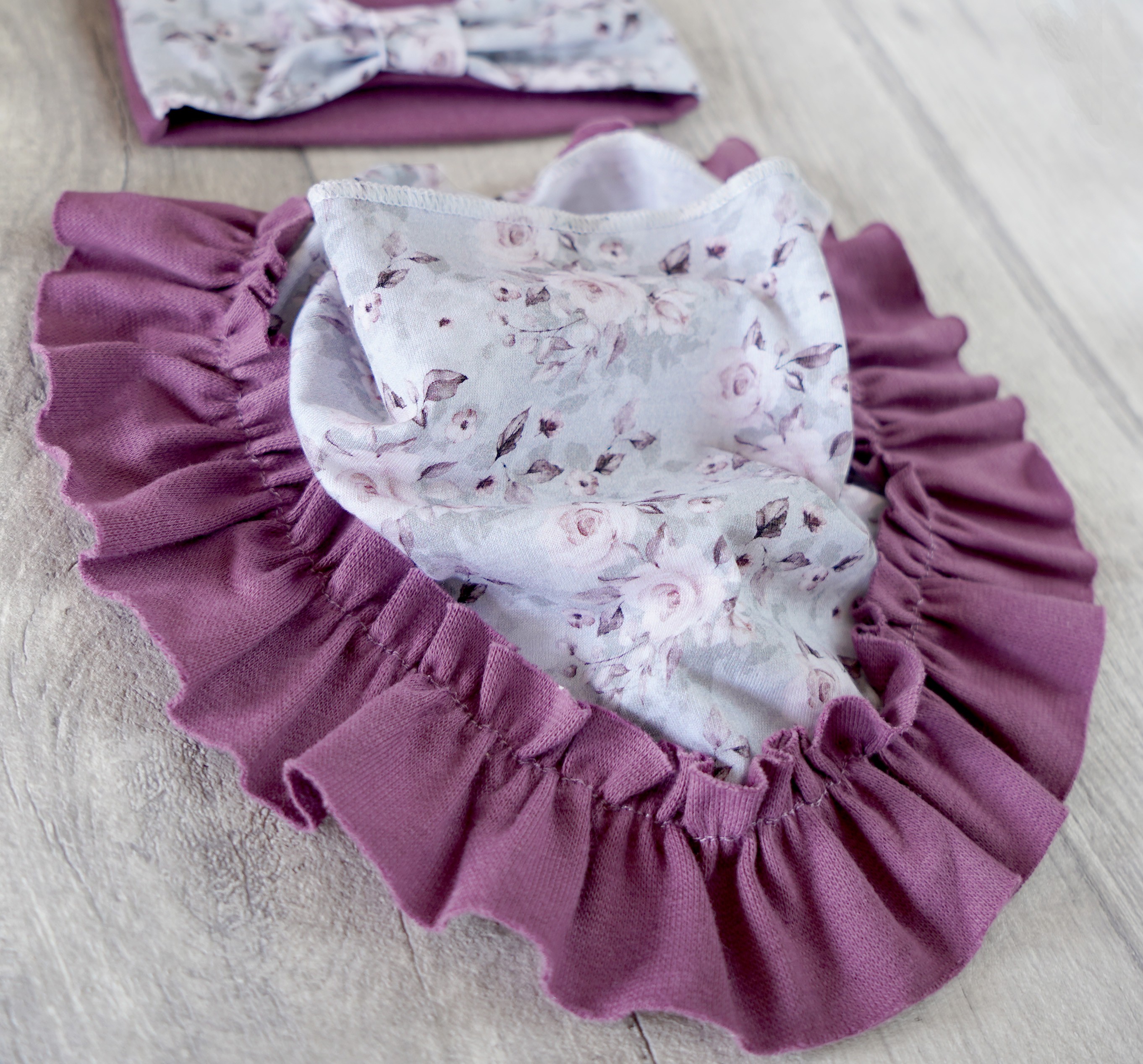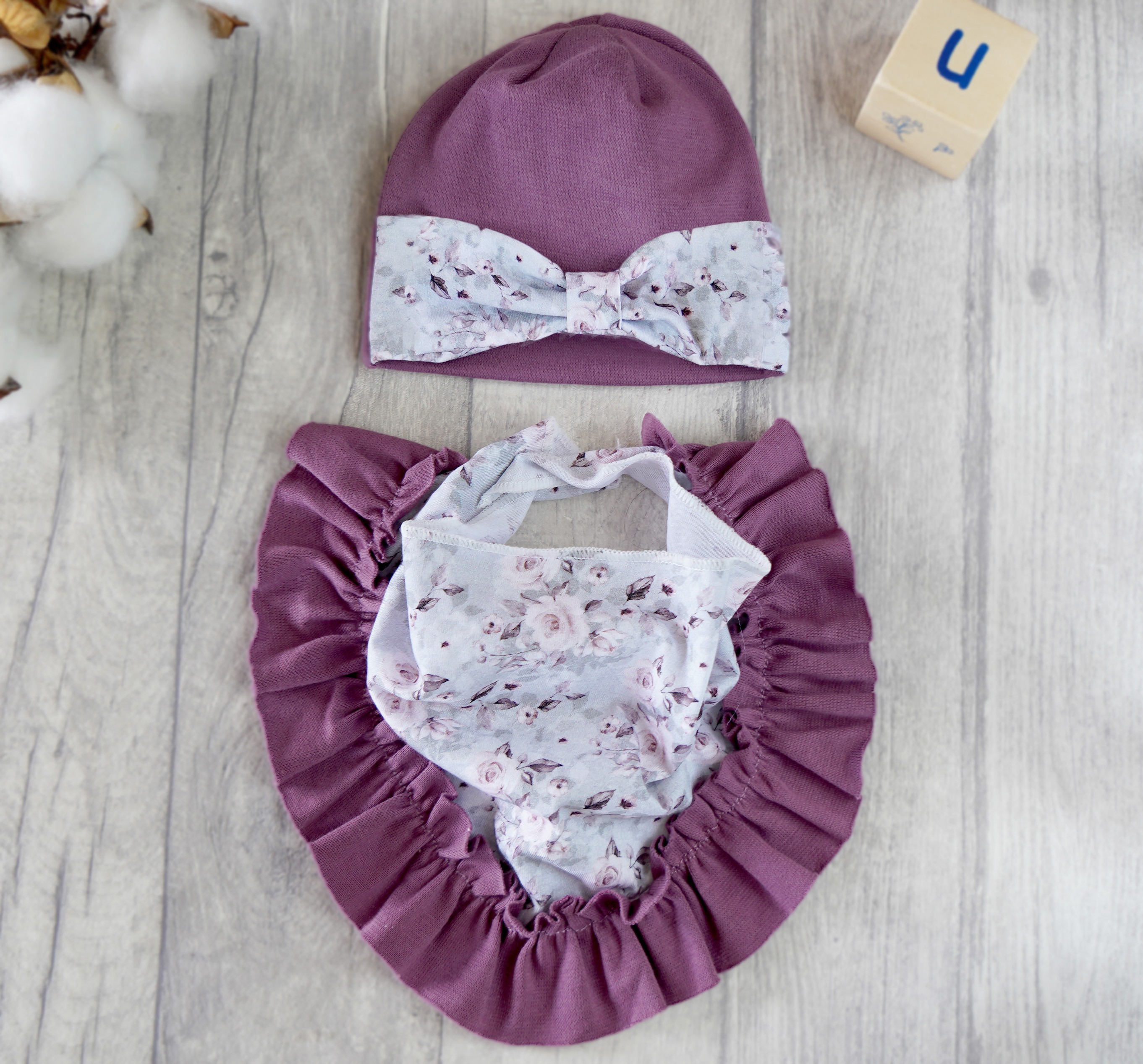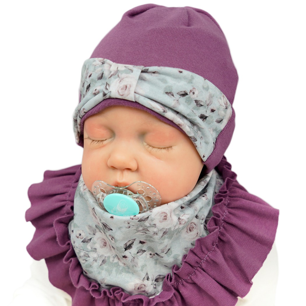 Bakłażan komplet CZAPKA + APASZKA z kokardką falbanką w kwiaty Maja wyprzedaż