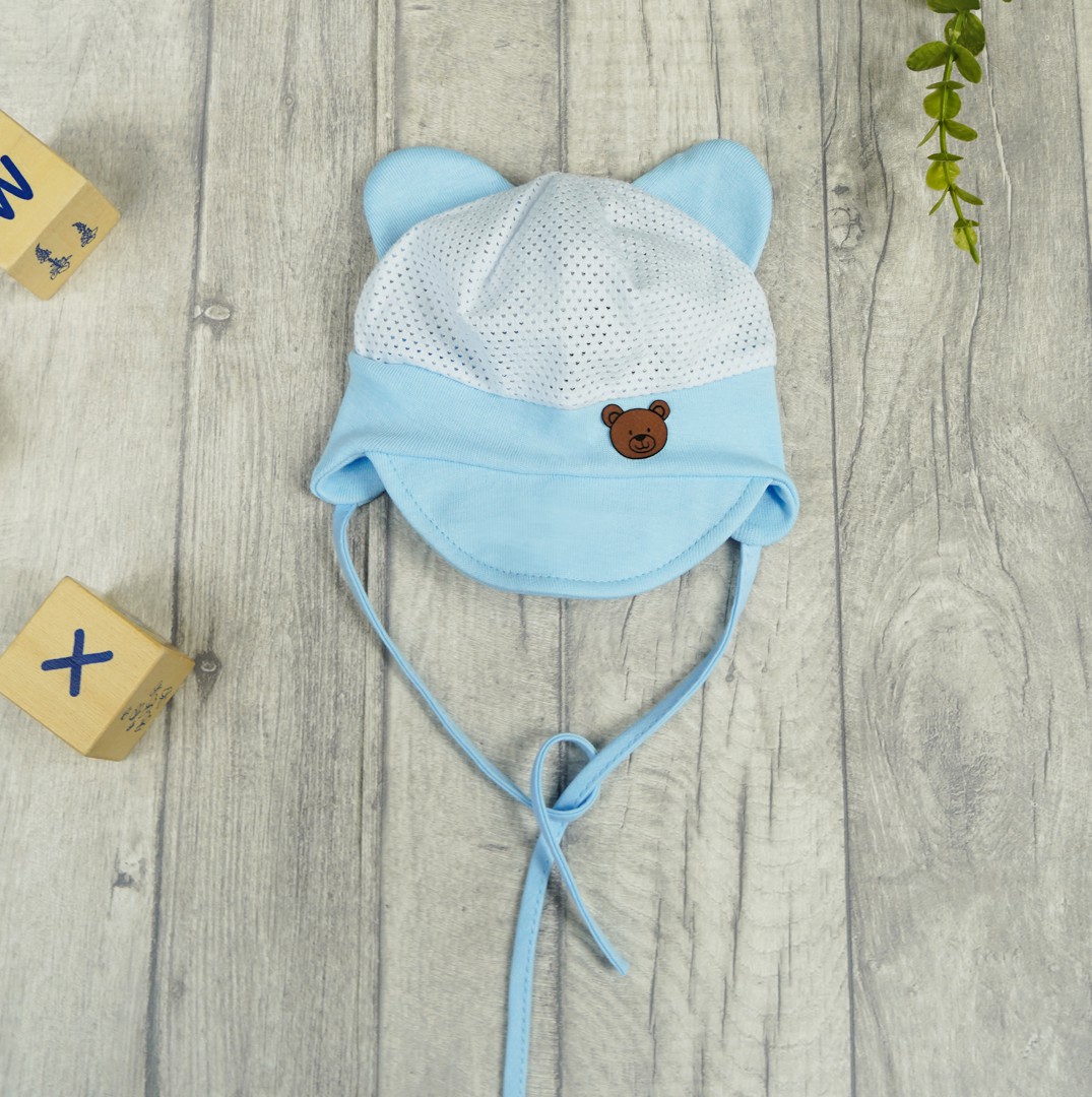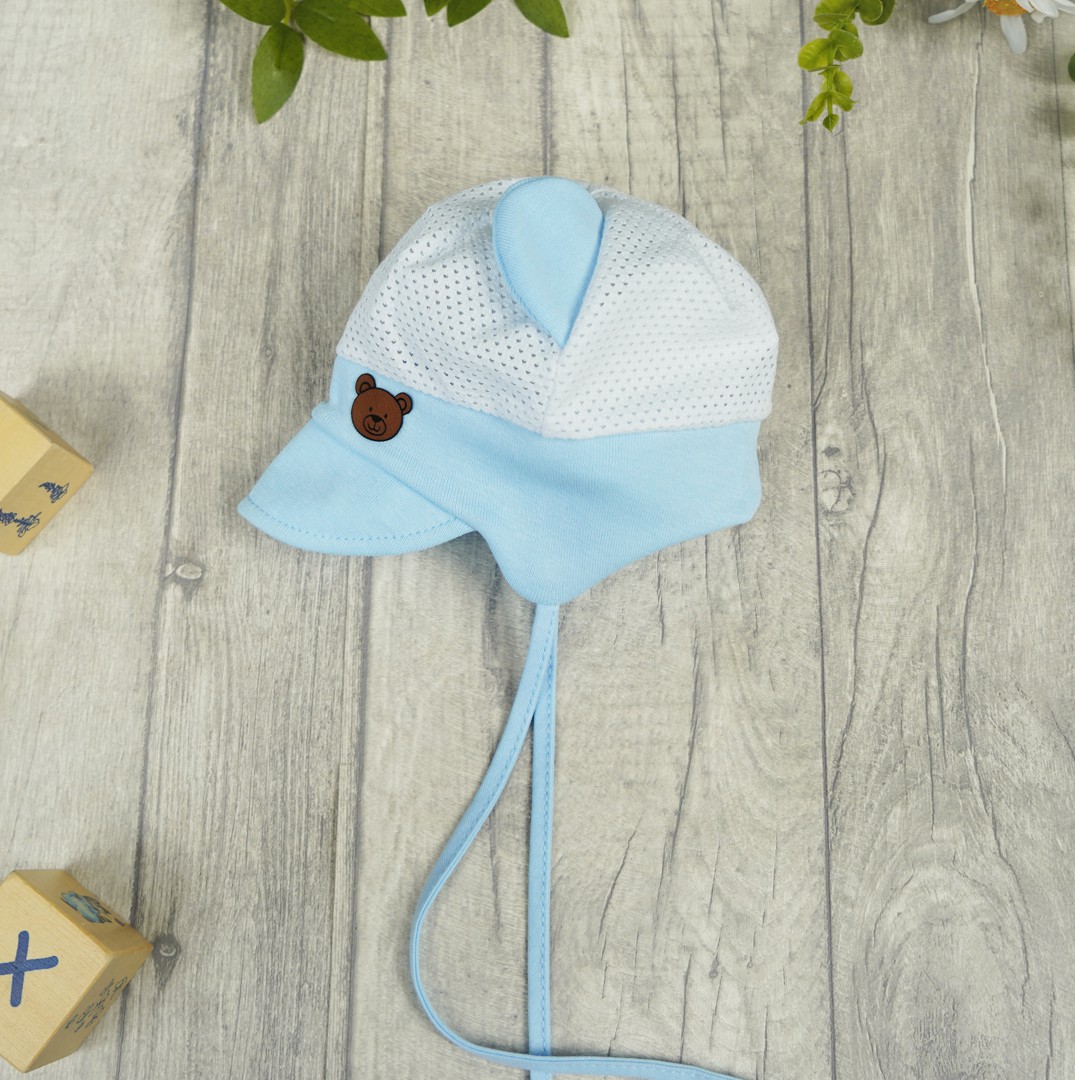 Czapka niemowlęca na lato wykonana z przewiewnej siateczki zapobiegającej poceniu się główki. Oferowany model to ponadczasowa czapeczka z daszkiem wiązana pod szyją. Czapeczka jest profilowana w okolicach uszu aby skutecznie ochronić uszka dziecka przed zawianiem. Model odpowiedni jako czapeczka letnia. Wykonana jest z miękkiego i przyjemnego materiału. Świetnie sprawdzi się w ciepłe lecz wietrzne dni gdy trzeba osłonić uszka ale nie spocić główki maluszka.