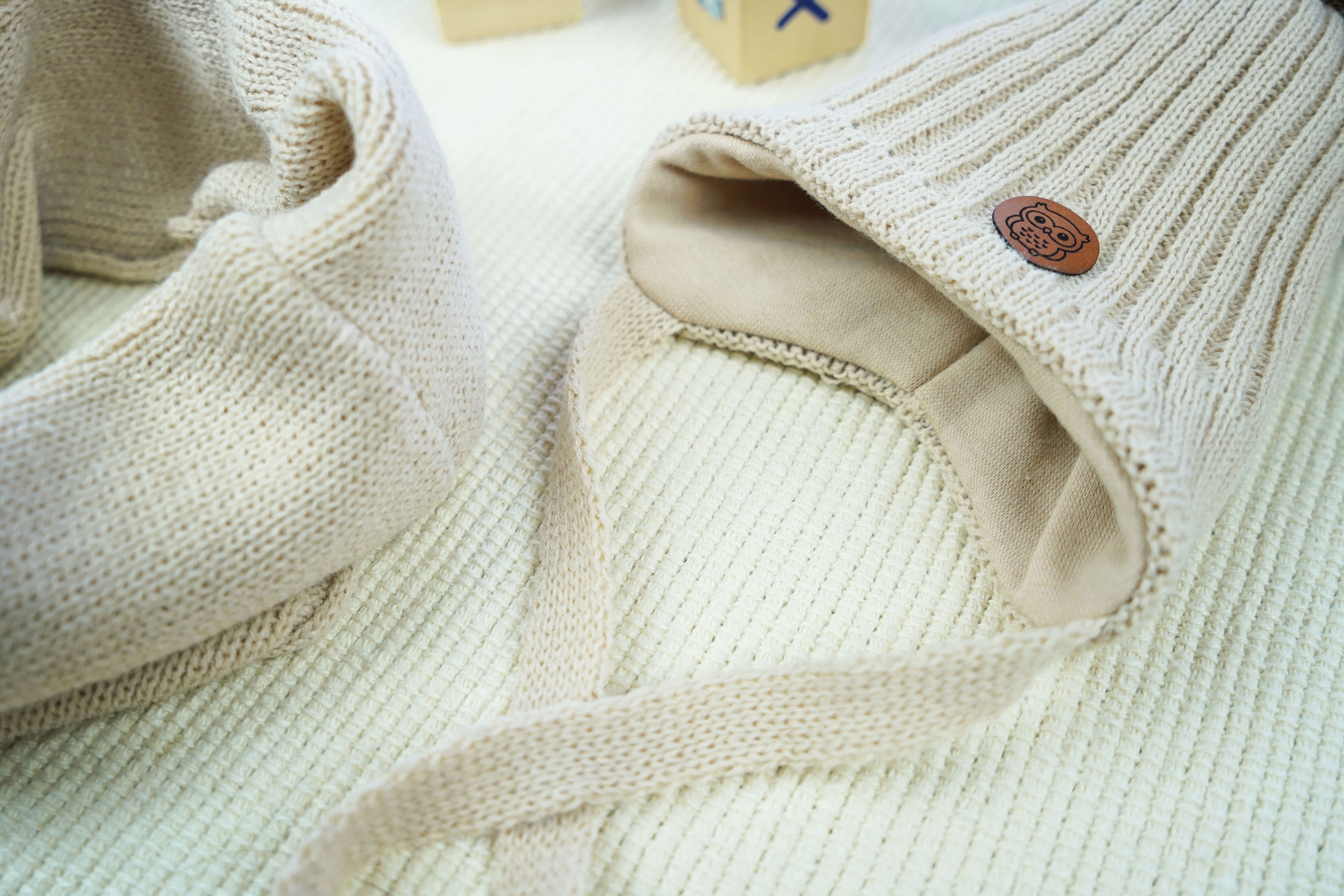 Jasna, beżowa czapka z pomponem i komin niemowlęcy. Idealny na wyjście ze szpitala i pierwsze zimowe spacery.