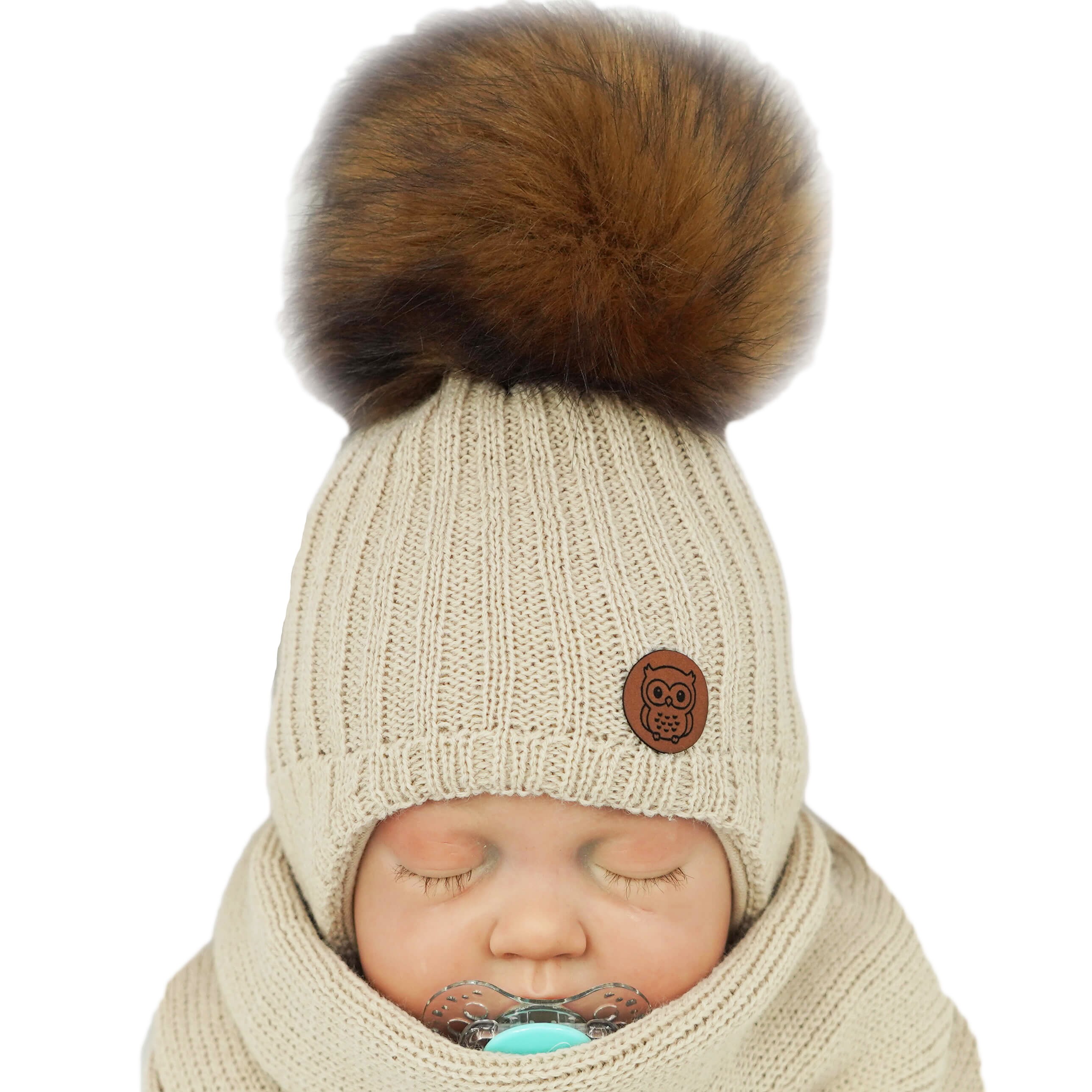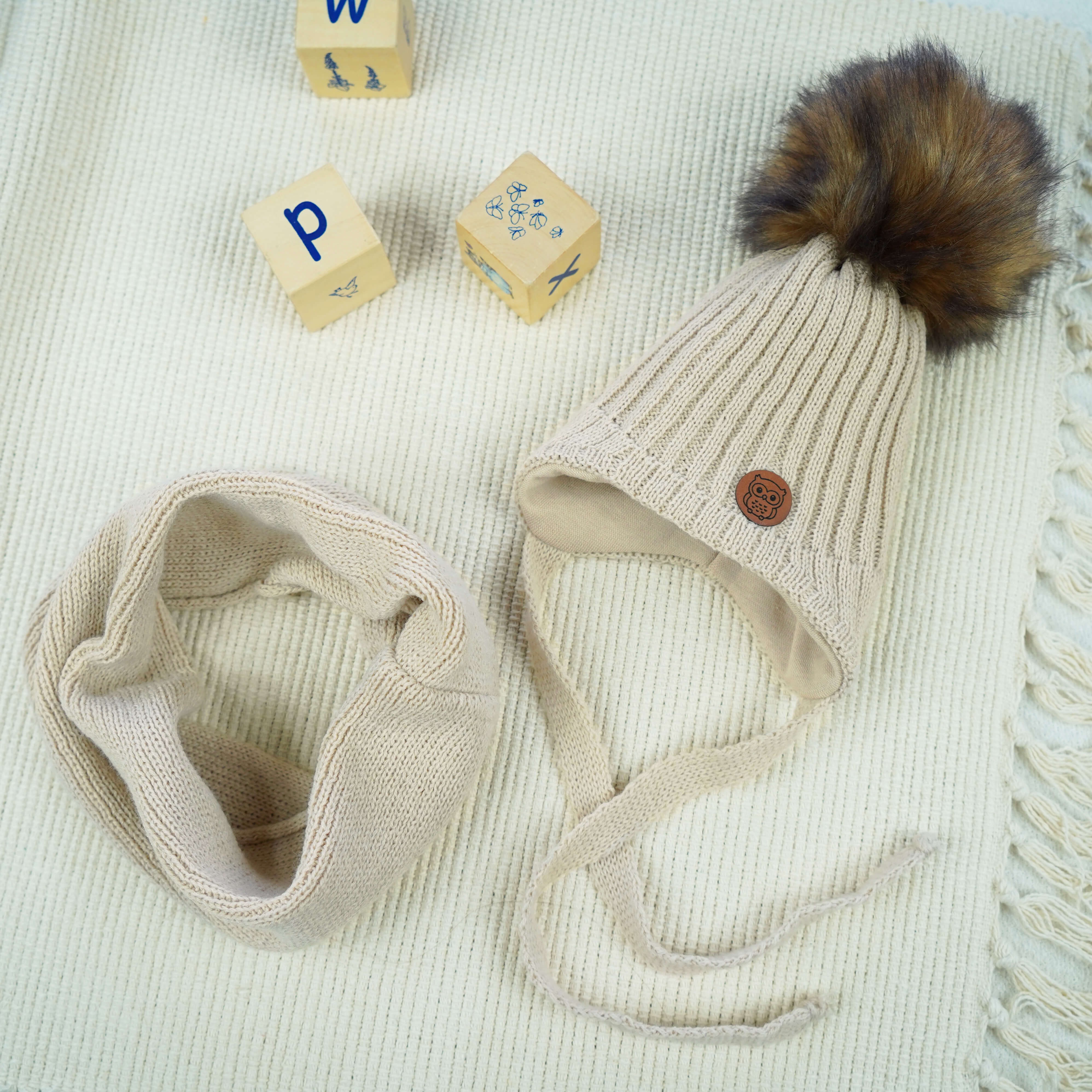 Jasno beżowy komplet zimowy SÓWKA czapka + komin z pomponem