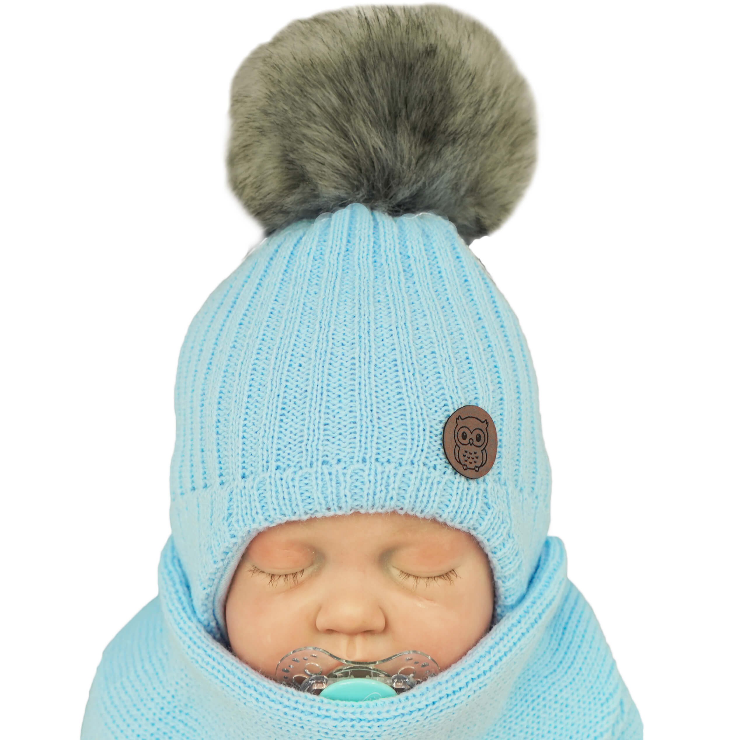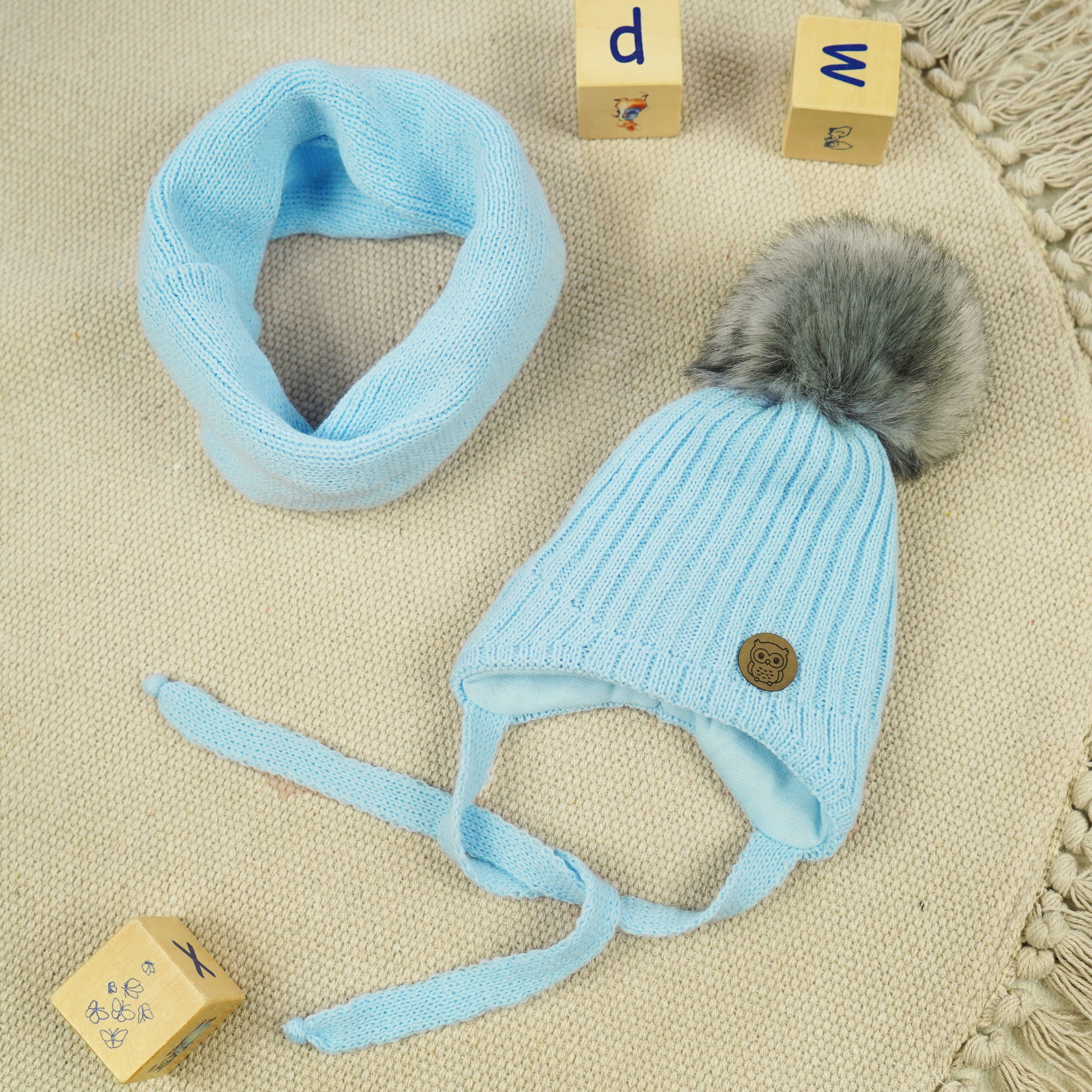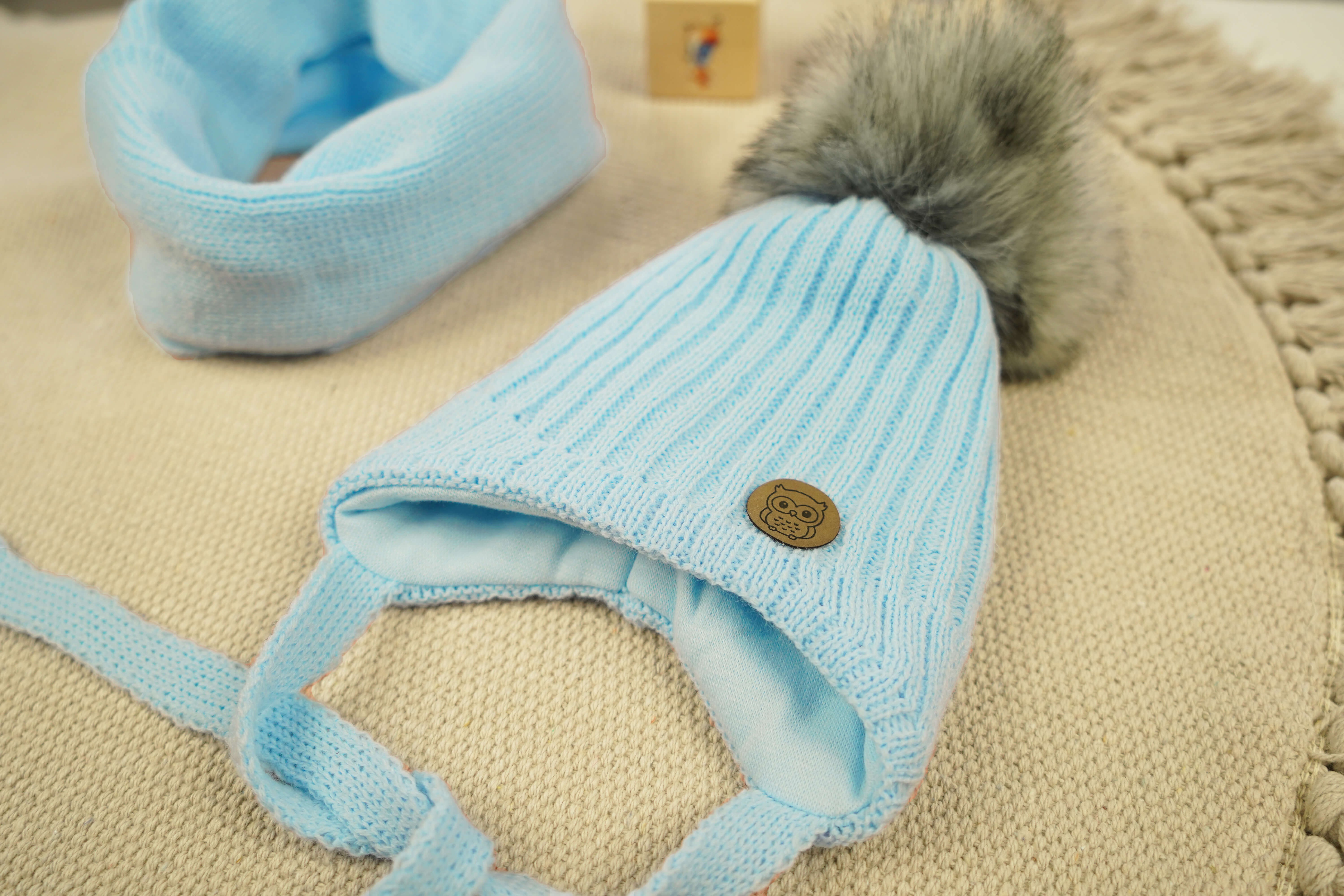 Niebieski komplet zimowy SÓWKA czapka + komin z pomponem