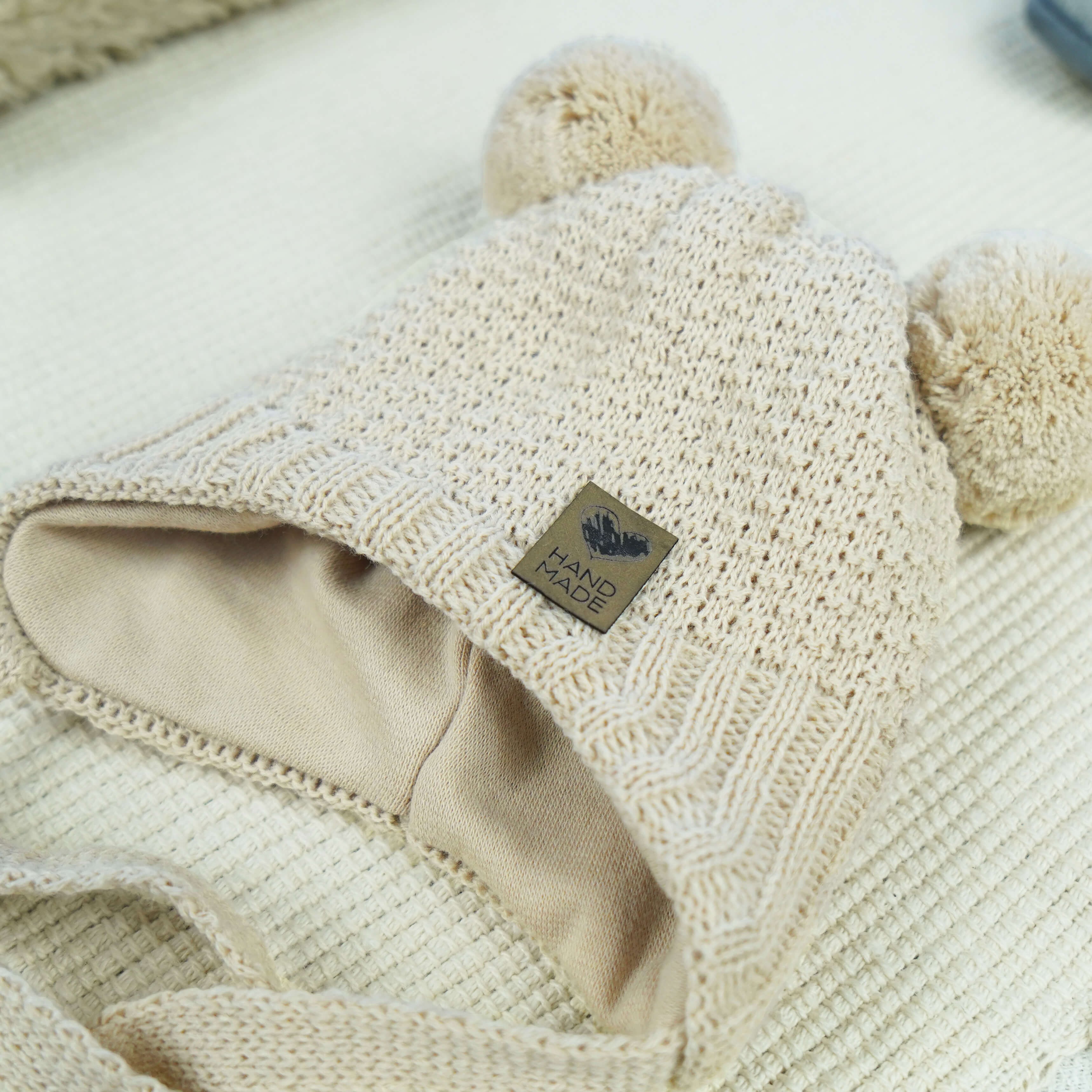 Jasnobeżowa czapka dziewiarska niemowlęca. Idealna na wyjście ze szpitala i pierwsze zimowe spacery.