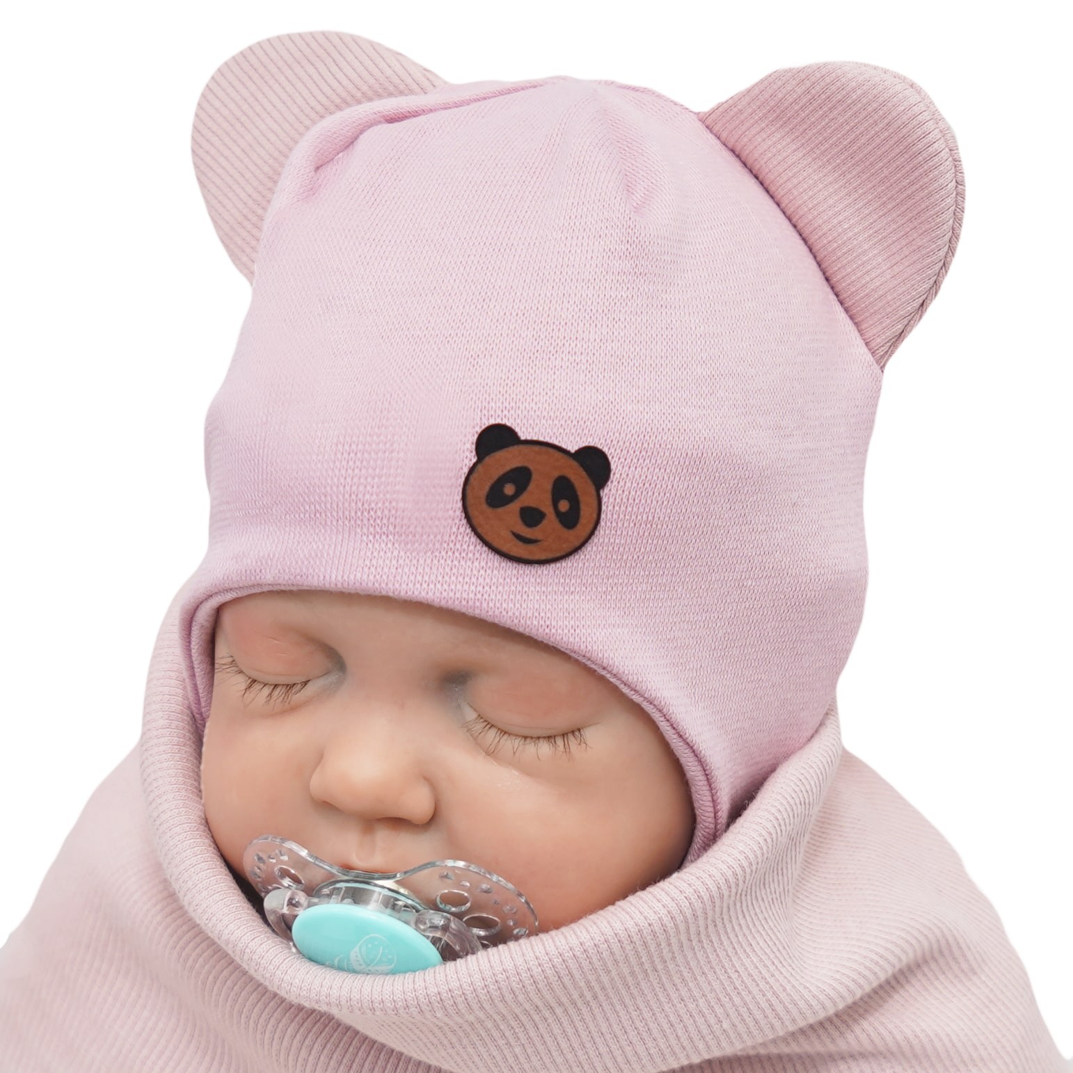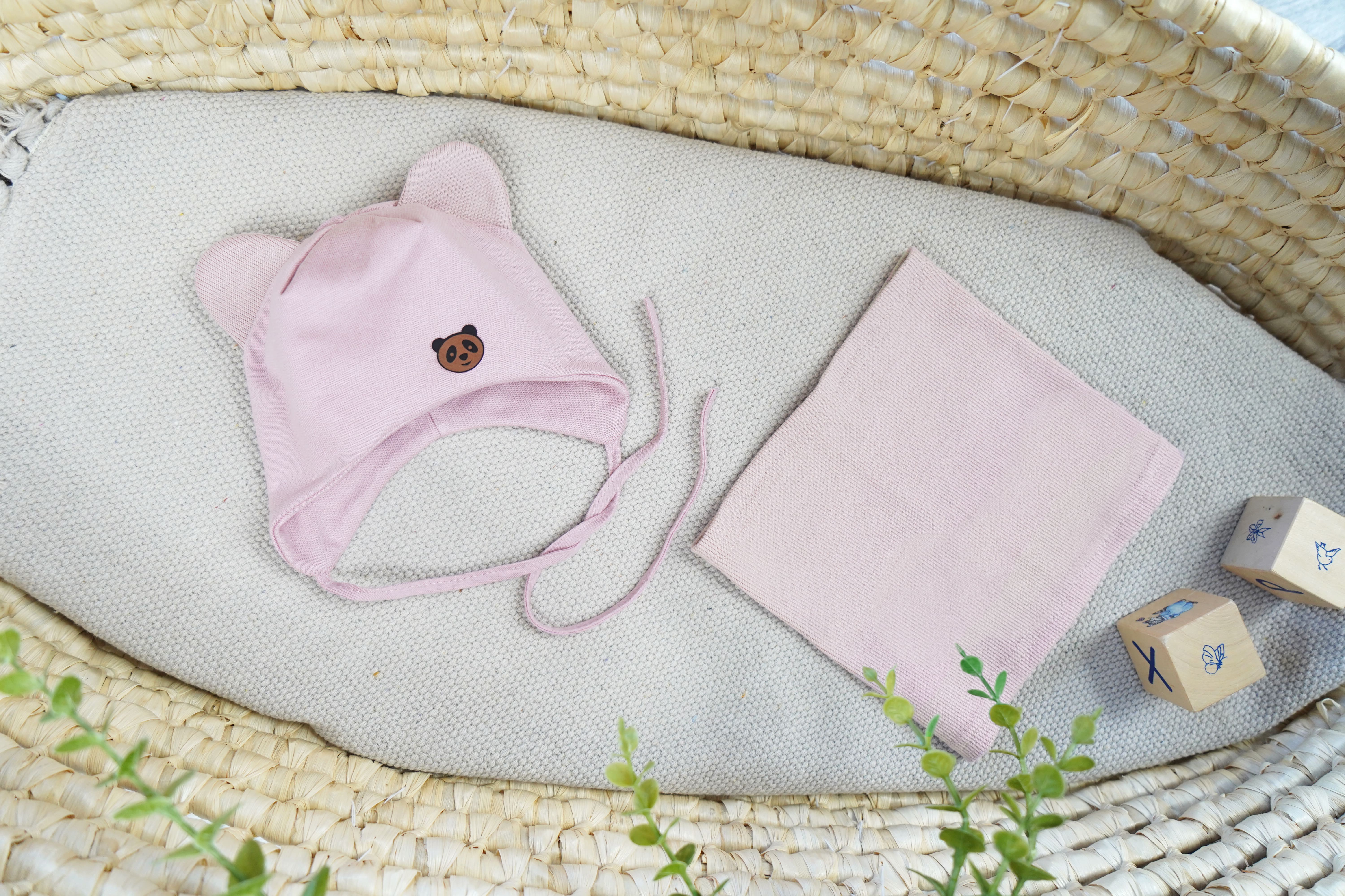 Oferowany model to czapeczka ozdobiona uszkami, wiązana pod szyją z aplikacją uroczej pandy. Uzupełnieniem czapeczki jest komin. Komplet został wykonany z bawełny w dwóch odcieniach brudnego różu.