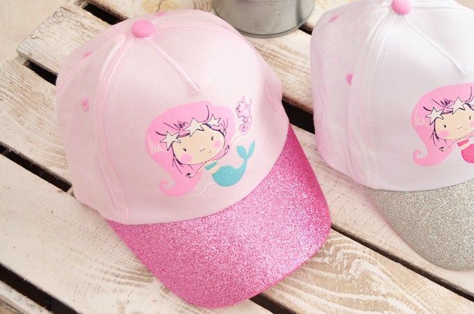 Czapeczka dziewczęca z profilowanym, twardym daszkiem, typ bejsbolówka. Główna ozdobą tej różowej czapki dla dziewczynki jest błyszczący, brokatowy daszek oraz nadrukowana z przodu aplikacja syrenki z brokatowym ogonkiem. Bejsbolówka posiada z tyłu gumkę oraz obszyte otwory wentylacyjne. Oferowany model to ponadczasowa dziewczęca bejsbolówka, odpowiednia jako czapeczka na lato.