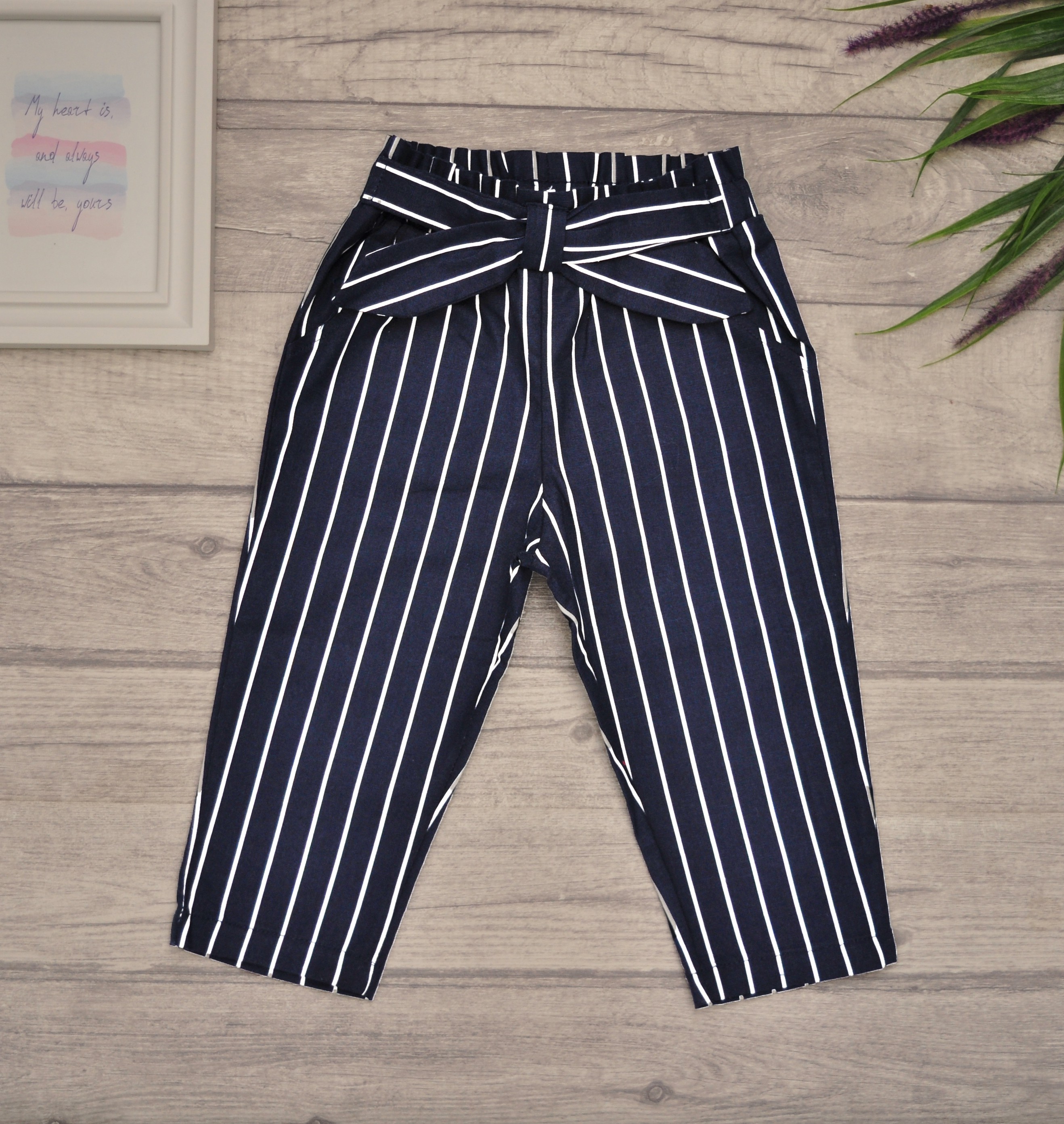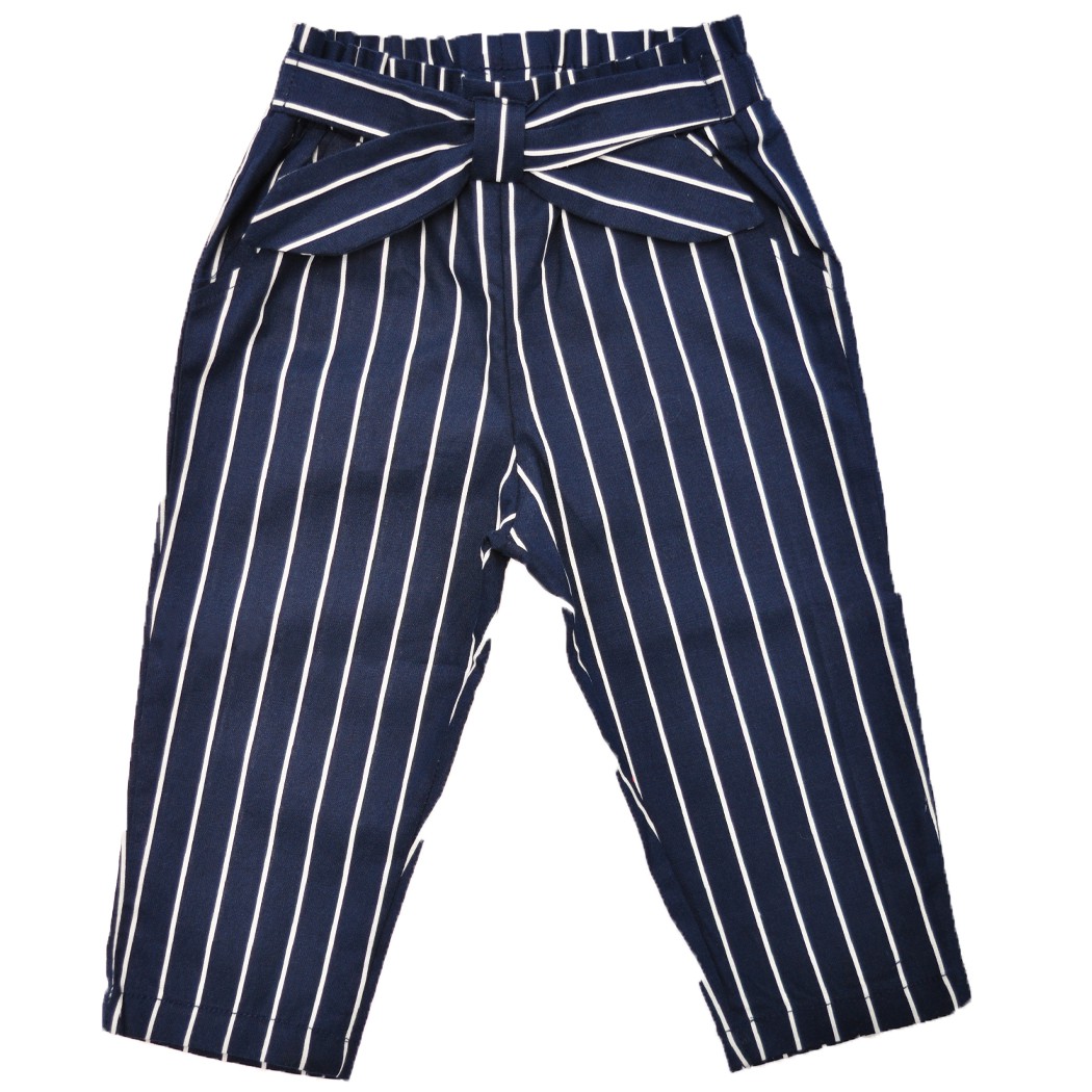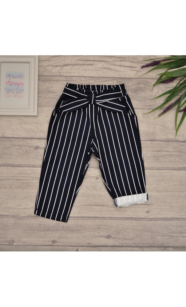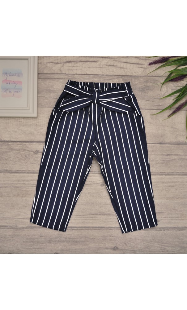 Granatowe SPODNIE bawełniane dziewczęce w paski z kokardą