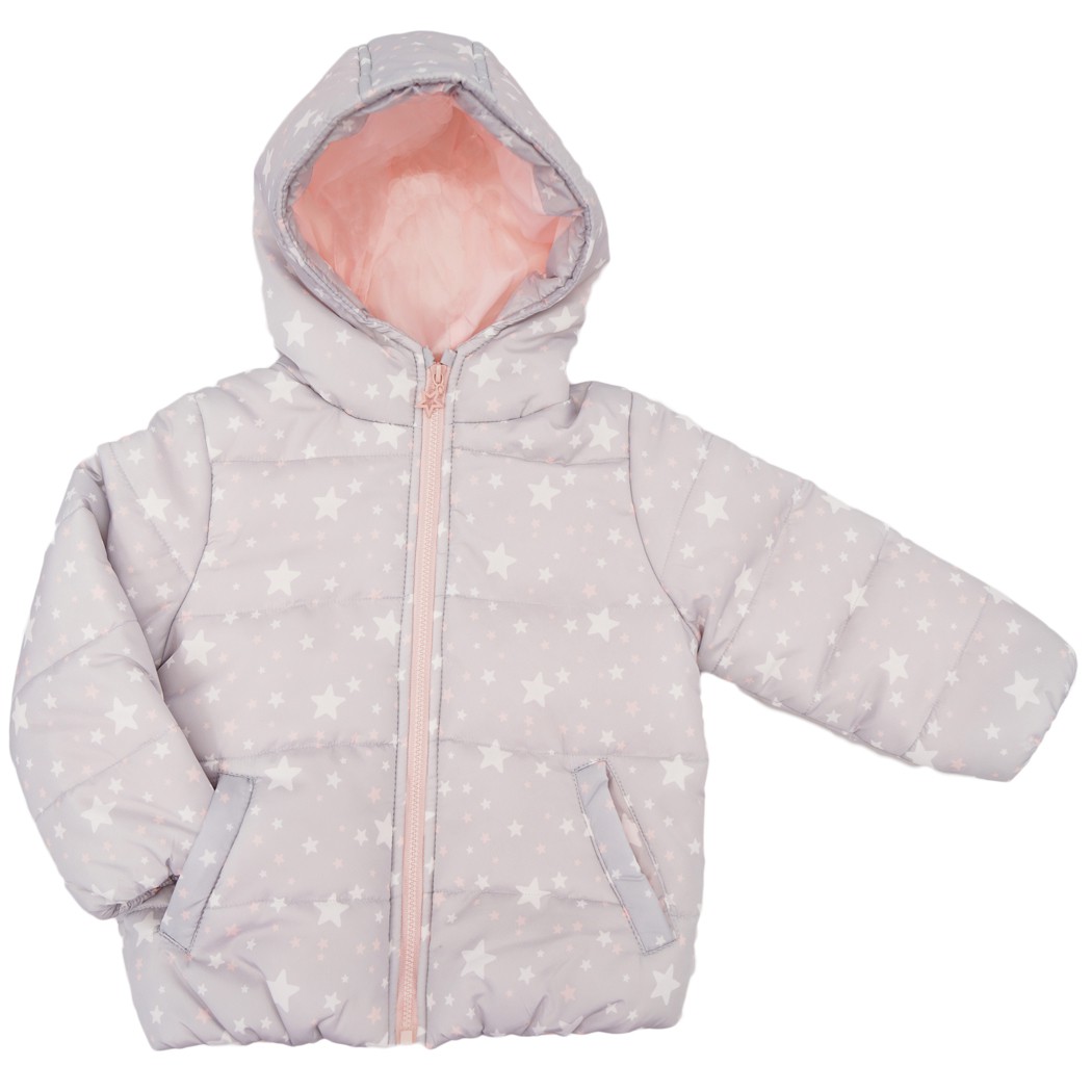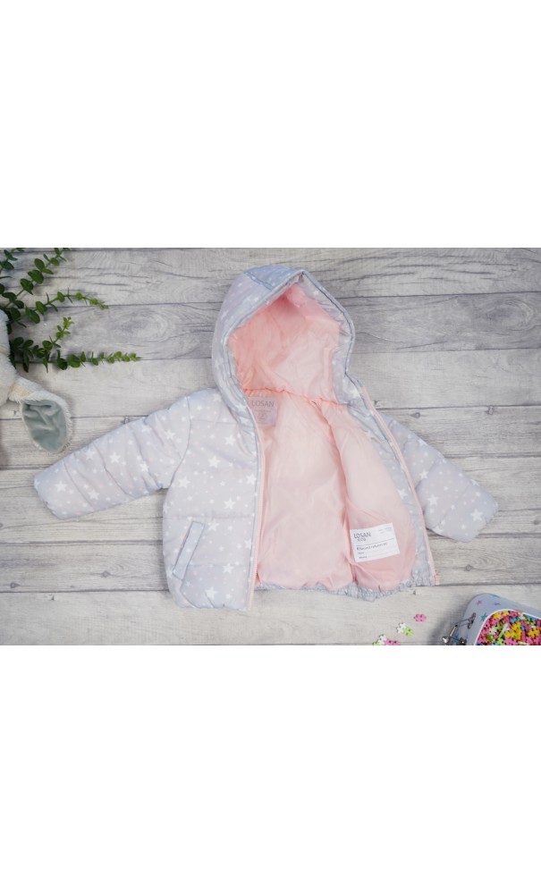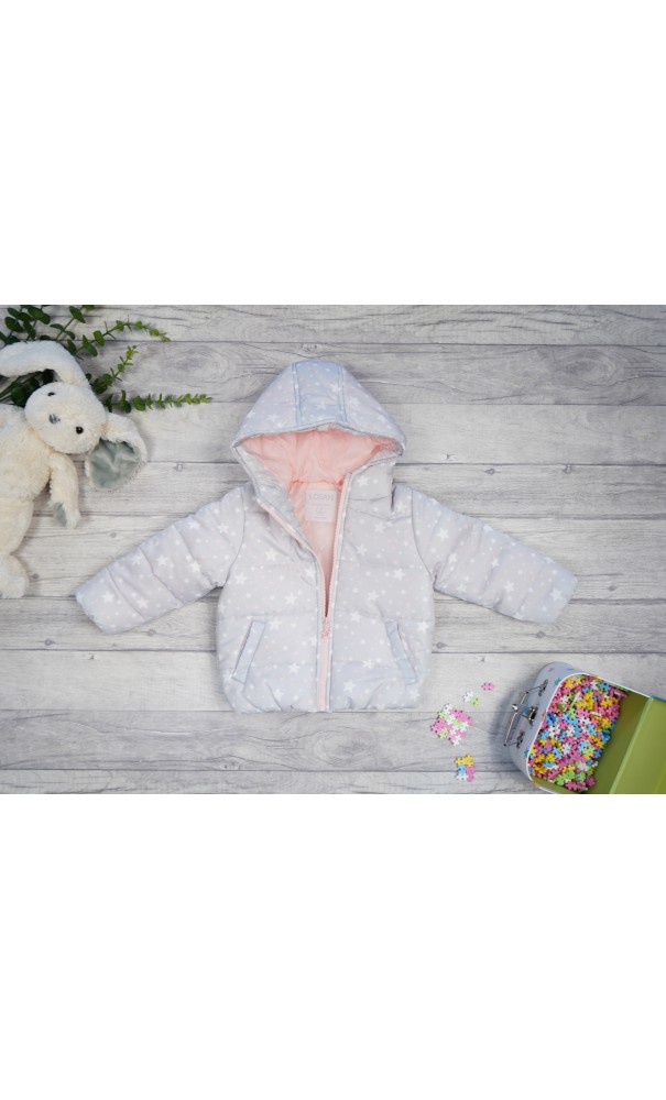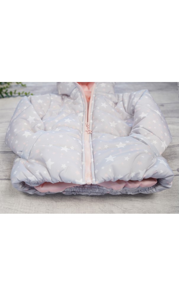 Dziewczęca kurtka ocieplana z kapturem w kolorze szarym w biało- różowe gwiazdki. Kurtka z kapturem zapinana na ozdobny suwak, posiada dwie, wpuszczone kieszenie oraz różową podszewkę.