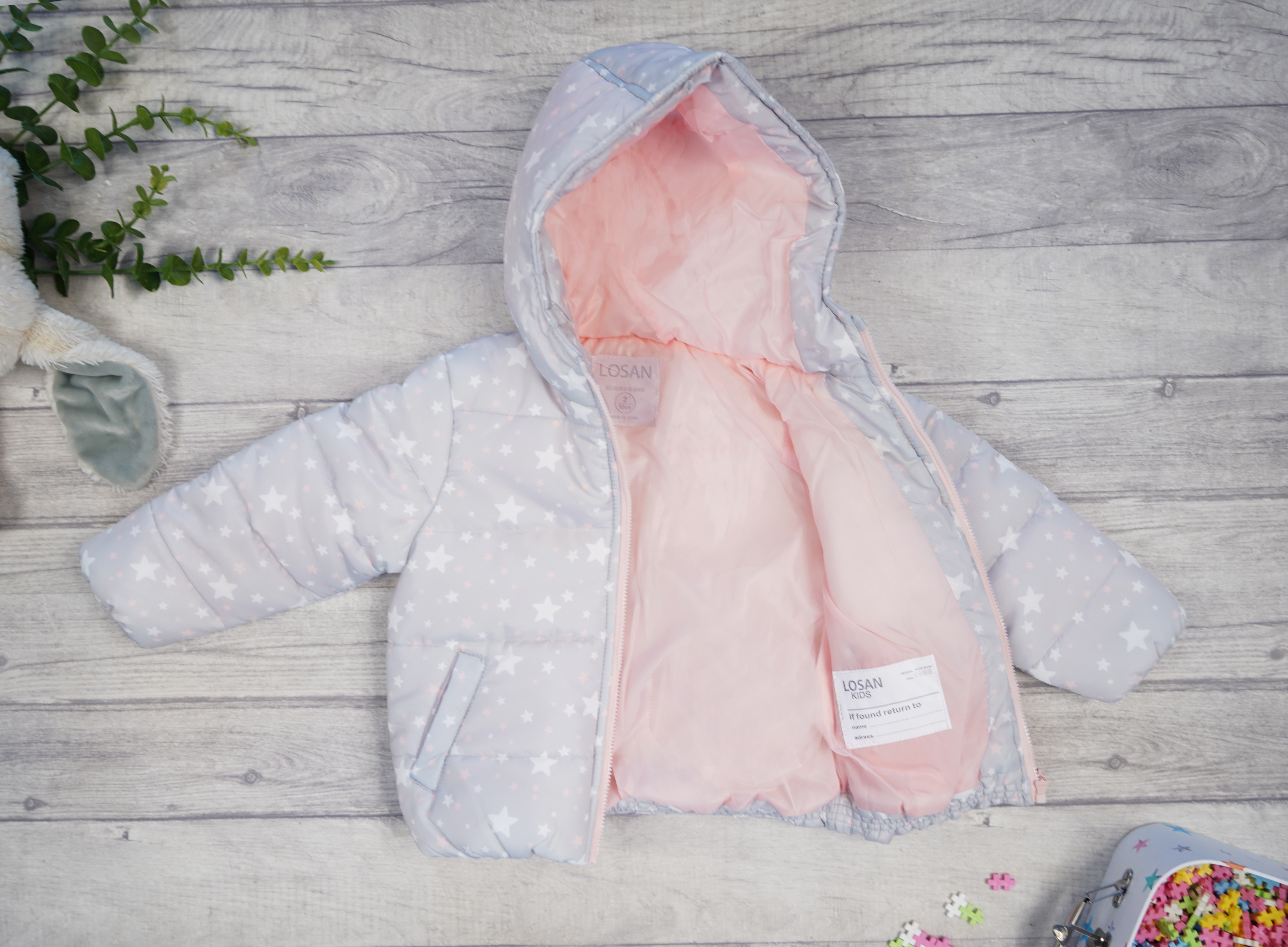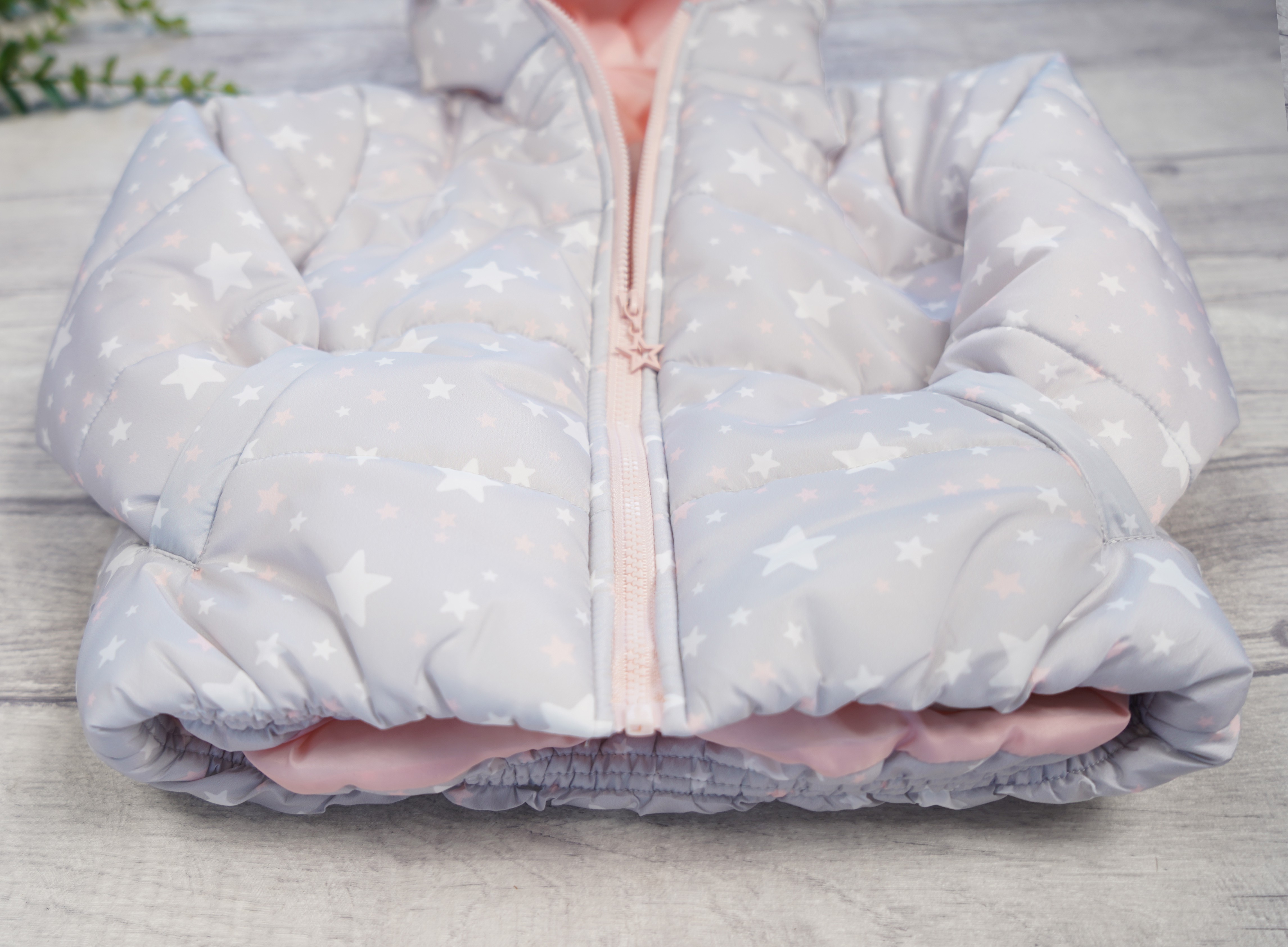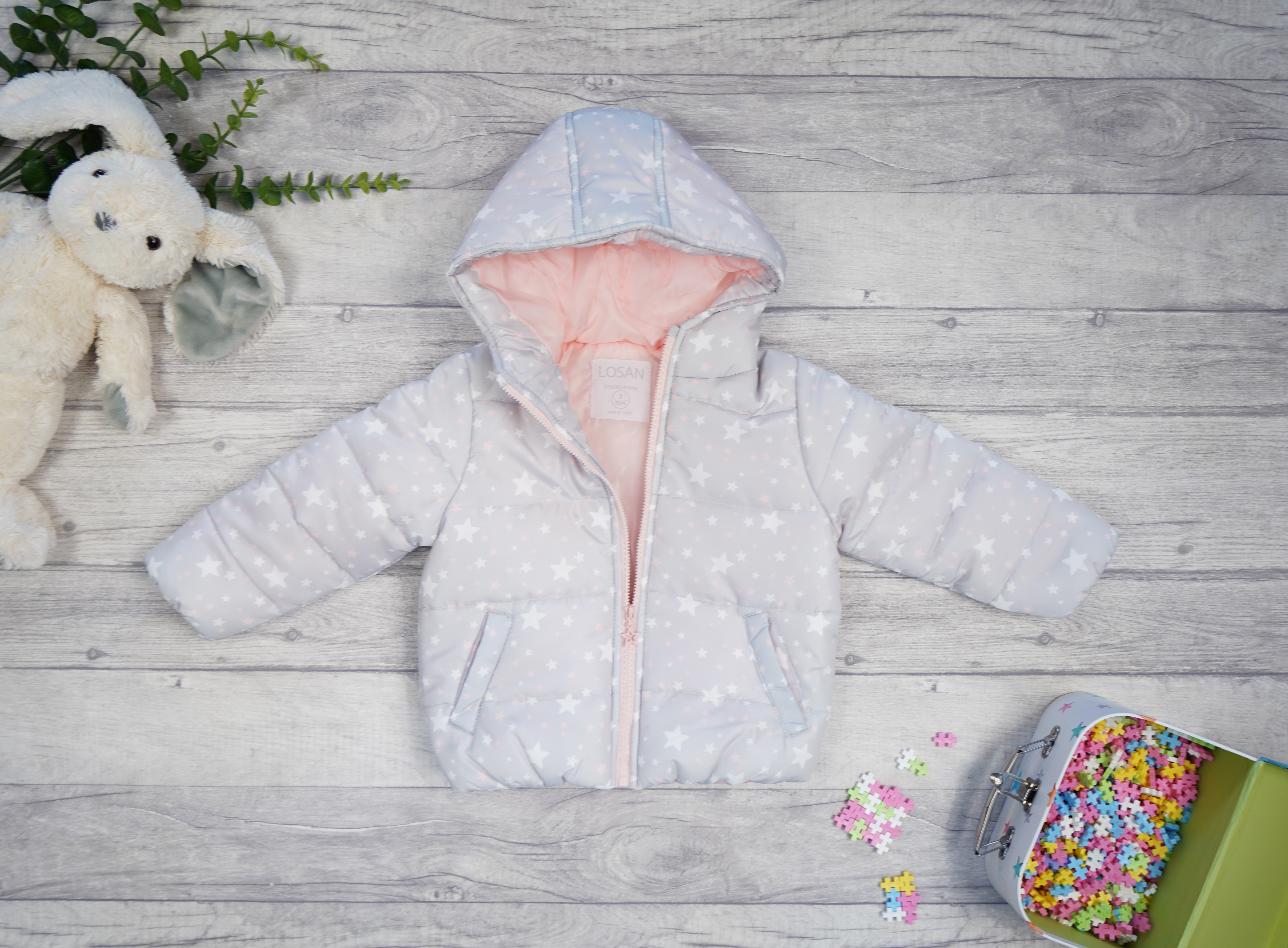 Dziewczęca kurtka ocieplana z kapturem w kolorze szarym w biało- różowe gwiazdki. Kurtka z kapturem zapinana na ozdobny suwak, posiada dwie, wpuszczone kieszenie oraz różową podszewkę.