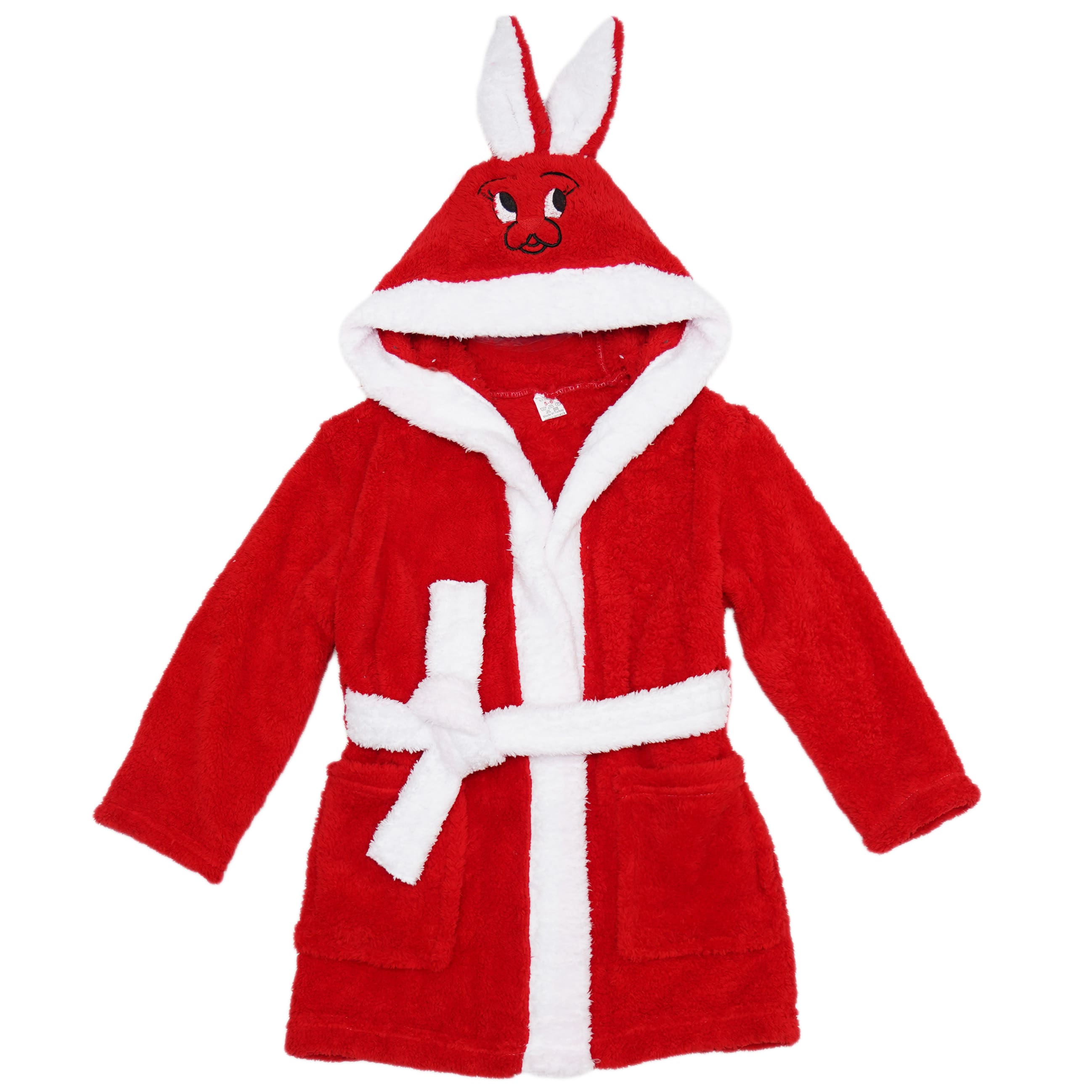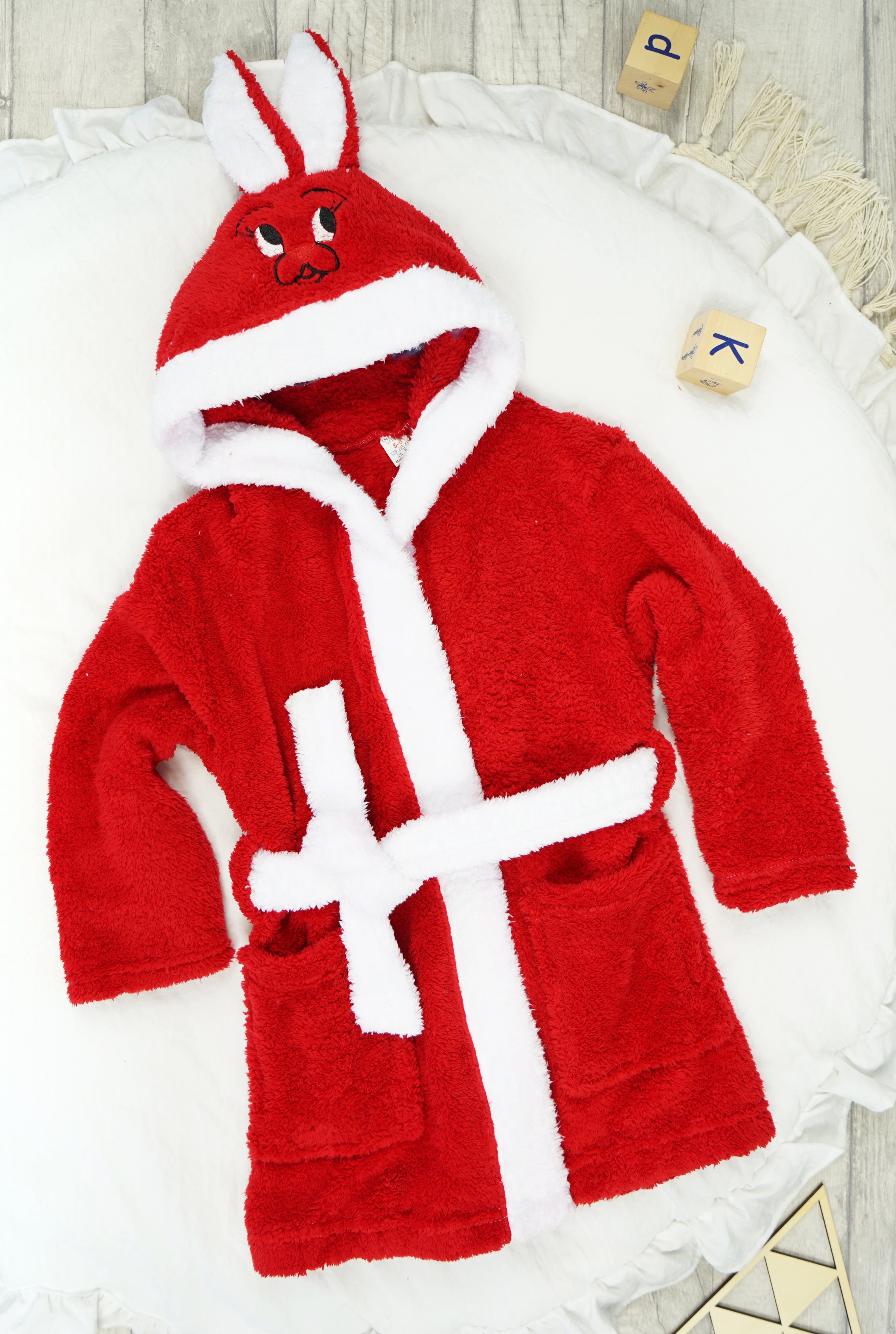 Czerwony ciepły SZLAFROK królik z kapturem wiązany święta