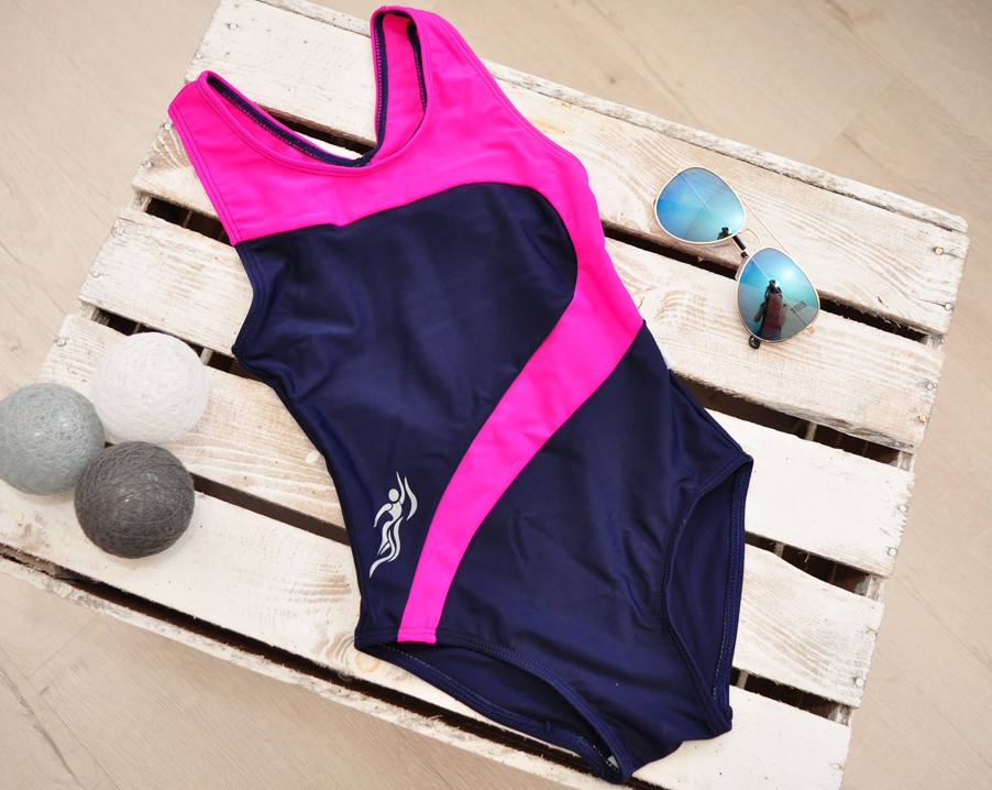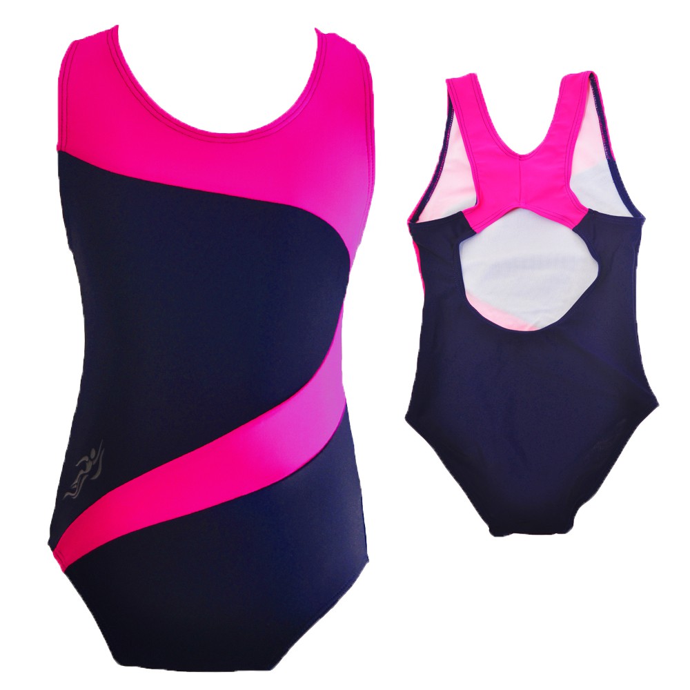 Kostium kąpielowy dla dziewczynki granatowy z różowymi wstawkami. Model sportowy, elastyczny, dopasowuje się do figury dziecka. Tył typu racer z wycięciem. Strój wykonany z elastycznego i świetnej jakości szybkoschnącego materiału zapewniającego jego trwałość i wygodę. Strój kąpielowy na basen dla dziewczynki jest delikatnie taliowany, posiada wszytą wewnętrzną higieniczną podszewkę na całej długości z przpdu oraz w kroczu.