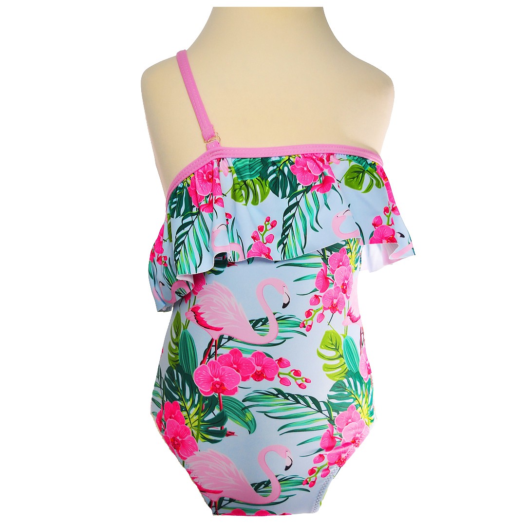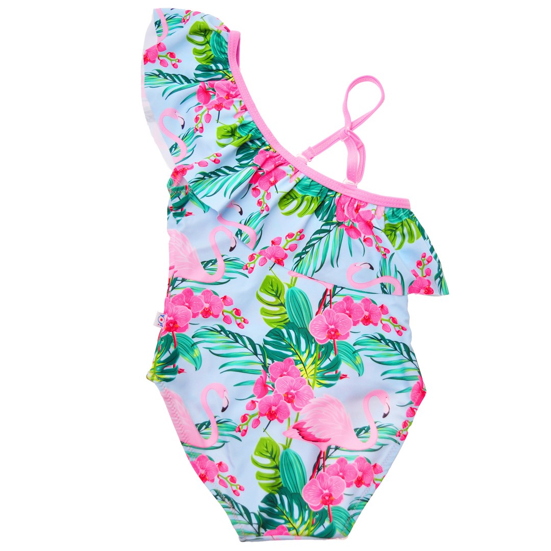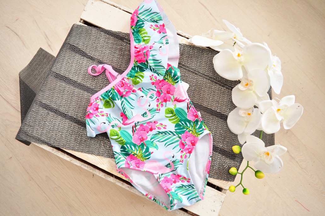 Kostium kąpielowy w flamingi z pojedynczym ramiączkiem i ozdobną falbanką. Model elegancki, dopasowuje się do figury dziecka. Strój wykonany z elastycznego i świetnej jakości szybkoschnącego materiału zapewniającego jego trwałość i wygodę. Kostium delikatnie taliowany, posiada wszytą wewnętrzną higieniczną podszewkę na całej długości z przodu oraz w kroczu.