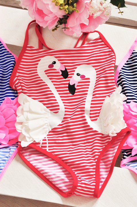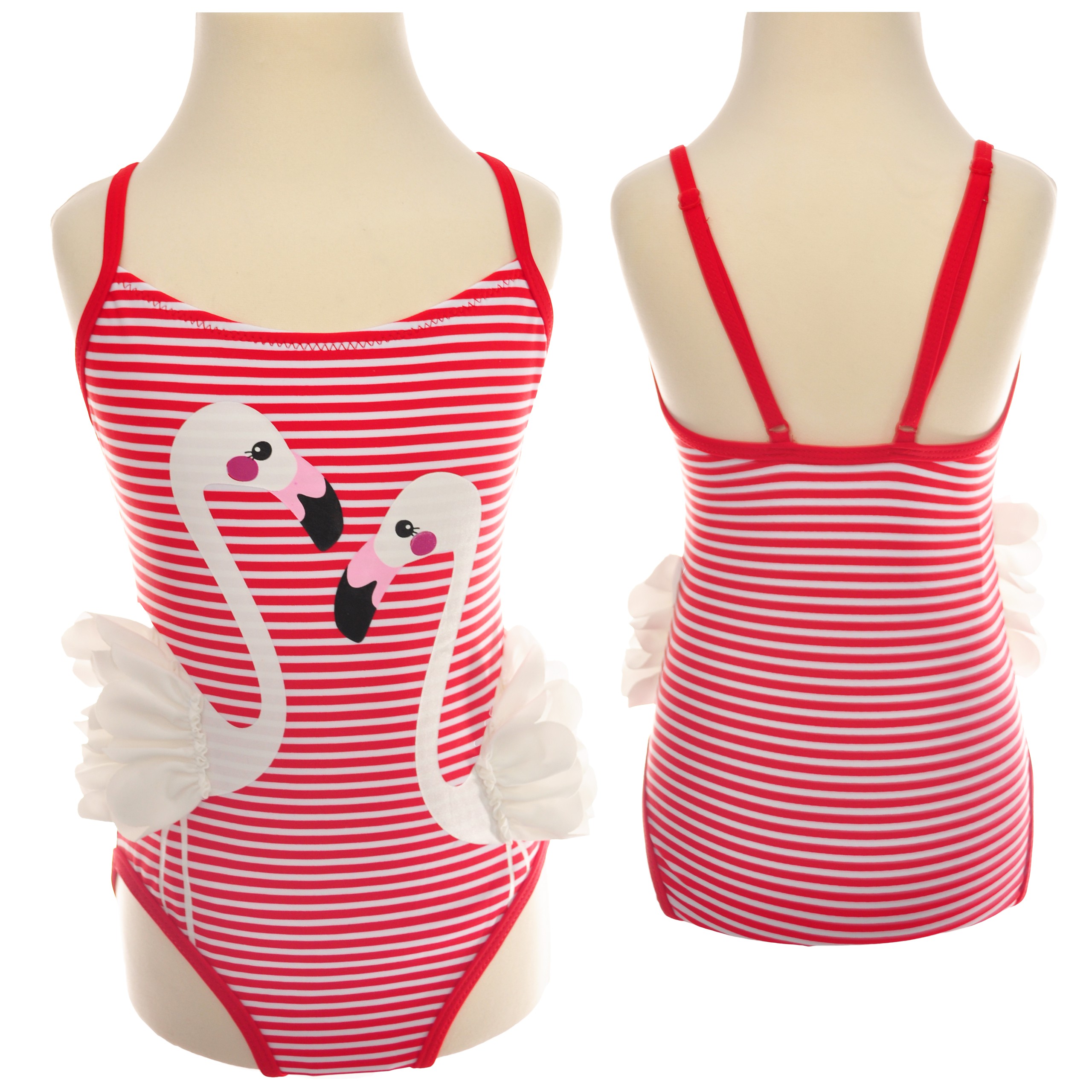 Dziewczęcy kostium kąpielowy w biało-czerwone paski z modną, wesołą, trójwymiarową aplikacją białych flamingów. Wyjątkową ozdobą tego dziewczęcego stroju do pływania są doszyte przestrzenne falbanki imitujące pióra flamingów. Model sportowy, elastyczny, dopasowuje się do figury dziecka. Strój wykonany z elastycznego i świetnej jakości szybkoschnącego materiału zapewniającego jego trwałość i wygodę. Posiada regulowane ramiączka oraz wszytą wewnętrzną higieniczną podszewkę.
