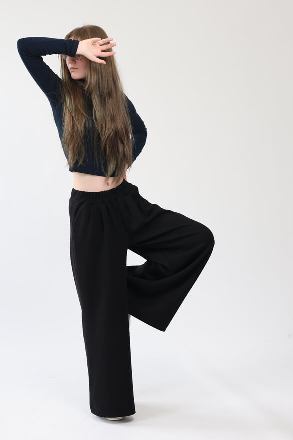 Nowoczesny styl - model BELLA wyróżnia się szerokimi nogawkami rozszerzanymi ku dołowi, które pięknie układają się w ruchu i nadają sylwetce wyjątkowego charakteru, a zakładki z przodu dodają spodniom klasycznego uroku.