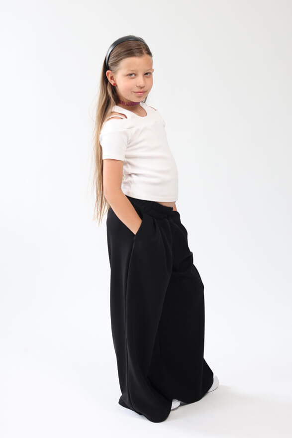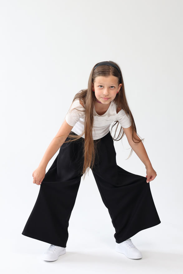 Eleganckie, gładkie, spodnie wizytowe w kolorze czarnym, z rozszerzanymi nogawkami dla dziewczynki.