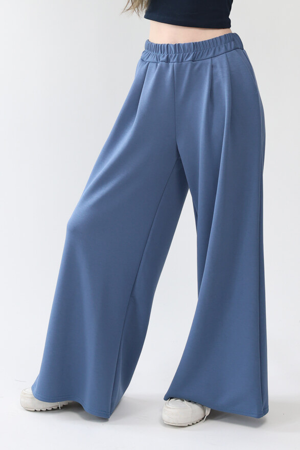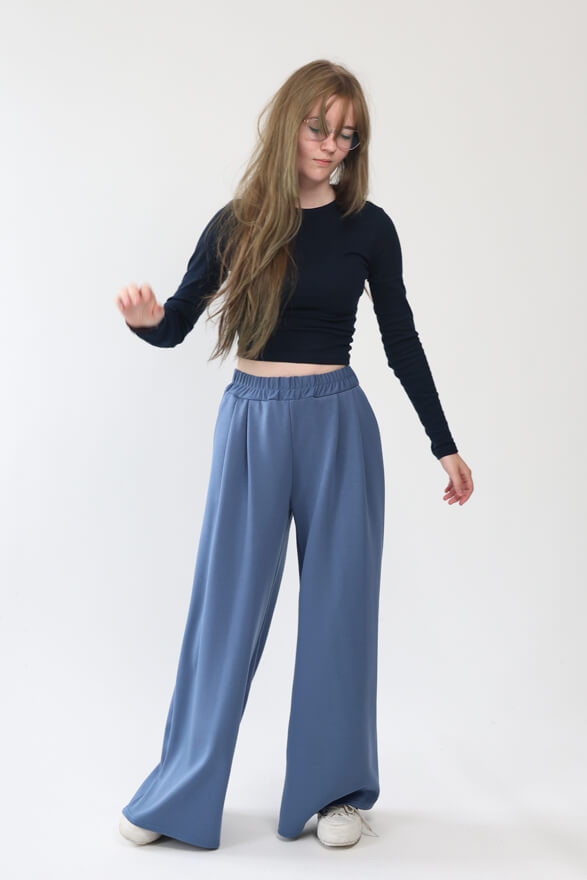 Nowoczesny styl - model BELLA wyróżnia się szerokimi nogawkami rozszerzanymi ku dołowi, które pięknie układają się w ruchu i nadają sylwetce wyjątkowego charakteru, a zakładki z przodu dodają spodniom klasycznego uroku.