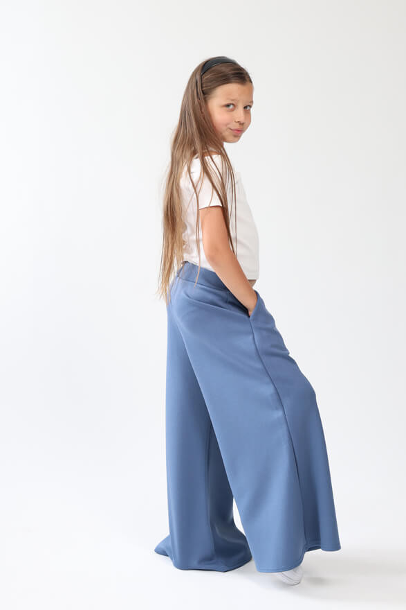 Eleganckie, gładkie spodnie wizytowe w kolorze granatu jeansowego z rozszerzanymi nogawkami dla dziewczynki.