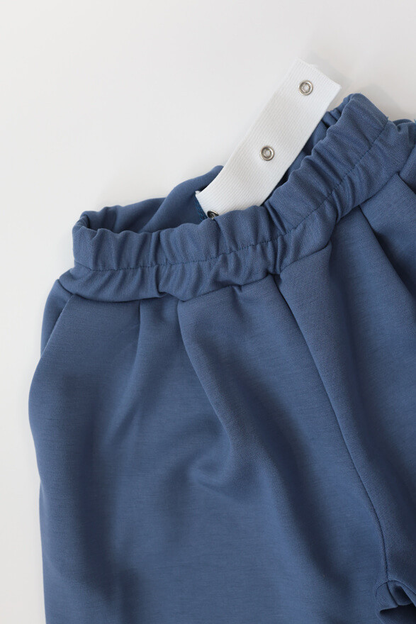 Regulowana gumka - spodnie posiadają w pasie, przy wewnętrznym szwie otwór, przez który w łatwy sposób można wyciągnąć gumkę i dzięki czterem napom ją wyregulować na odpowiednią szerokość. Zakres regulacji wynosi 15 cm (5 cm - odległość pomiędzy napami). Istnieje możliwość zmniejszenia lub zwiększenia obwodu pasa. To rozwiązanie idealne na rosnące potrzeby młodej elegantki.