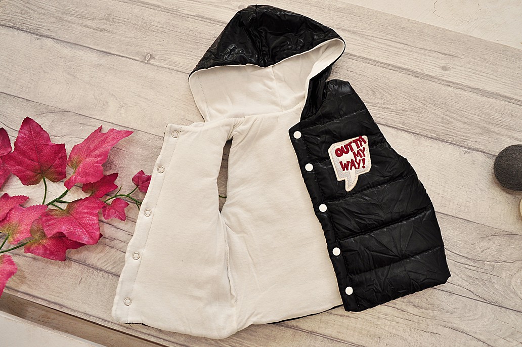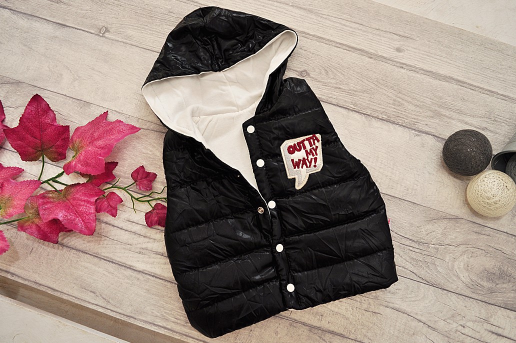 Czarny bezrękawnik z kapturem z naszyta na piersi. Kamizelka zapinana przez całą długość na napki podszyta od wewnątrz białą bawełnianą podszewką. Kaptur tego bezrękawnika niemowlęcego również został podszyty białą podszewką z nadrukiem. Kamizelka posiada na piersi aplikację z napisem OUTTA MY WAY!