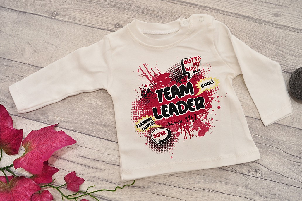 Bluzeczka z długim rękawem w kolorze ecru z nadrukiem TEAM LEADERS. Dół, dekolt oraz rękawy bluzy wykończone delikatnym ściągaczem. Bluzka dla niemowlaka zapinana na ramieniu na dwie napki.