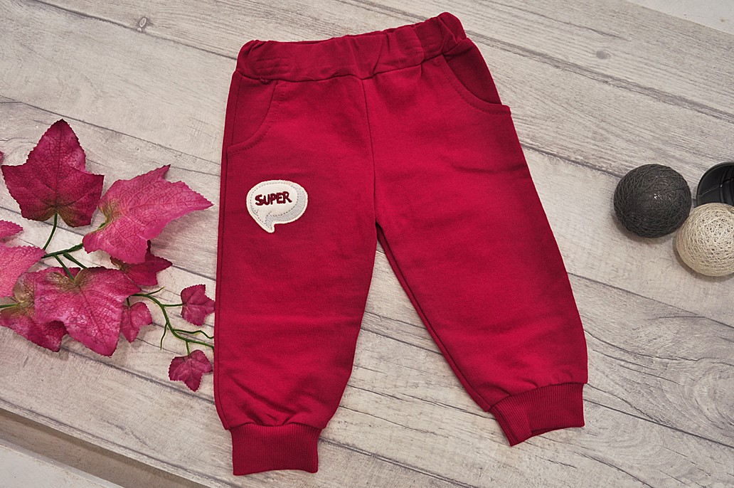Bordowe spodenki dresowe posiadają elastyczną gumkę w pasie a jedna nogawka została przyozdobiona białym emblematem z napisem SUPER.