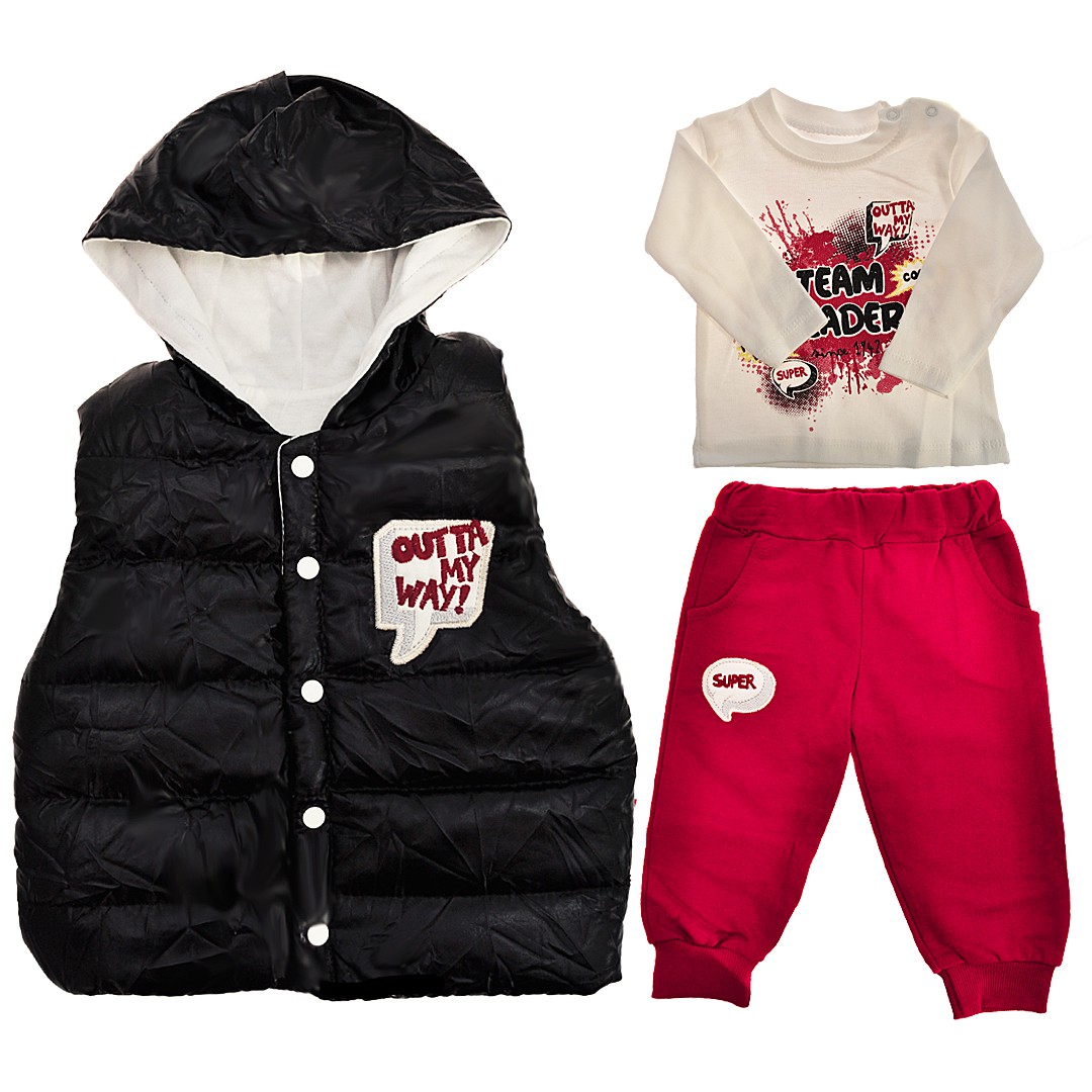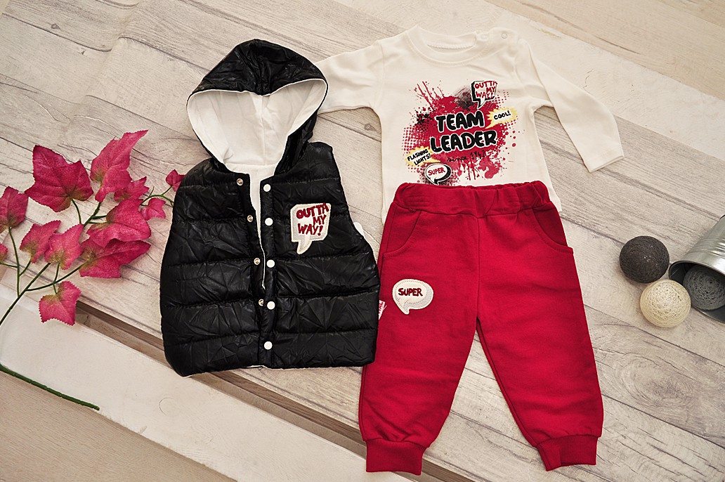 Komplet 3-częściowy w skład którego wchodzą: czarny bezrękawnik, bordowe spodnie oraz ecru bluzeczka z nadrukiem.