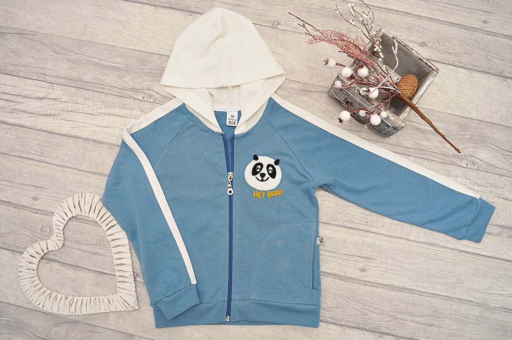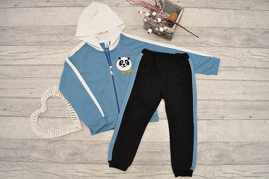 Błękitna bluza dresowa, zasuwana na suwak przez całą długość. bluza posiada biały kaptur a jej rękawy posiadają białe lampasy. Ozdobą tej dresowej bluzy jest puchata aplikacja misia panda na piersi. Bluza posiada dwie wewnętrzne kieszenie. Spodenki w kolorze czarnym posiadają elastyczną gumkę w pasie a po bokach nogawek znajdują się lampasy w koorze pastelowego błękitu. Nogawki spodenek wykończone ściągaczem.